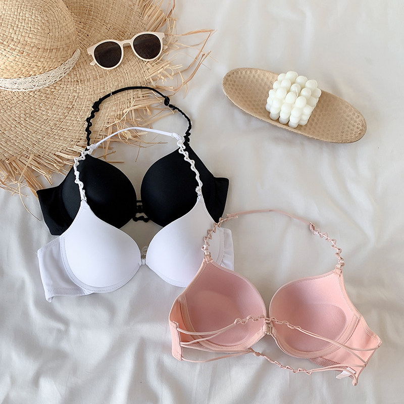 网红新爆款前扣美背内衣女纯欲聚拢文胸无痕调整型露背挂脖小胸罩