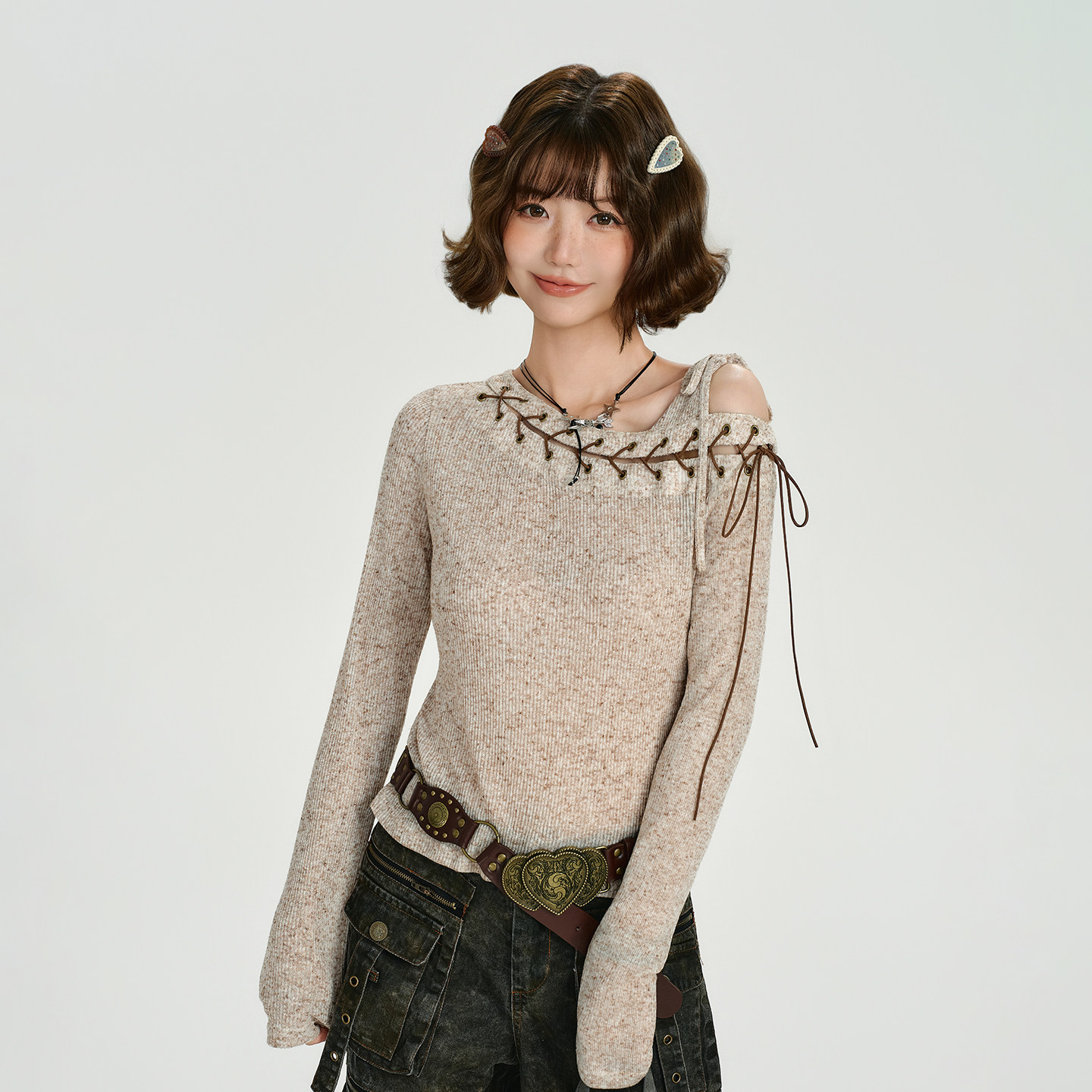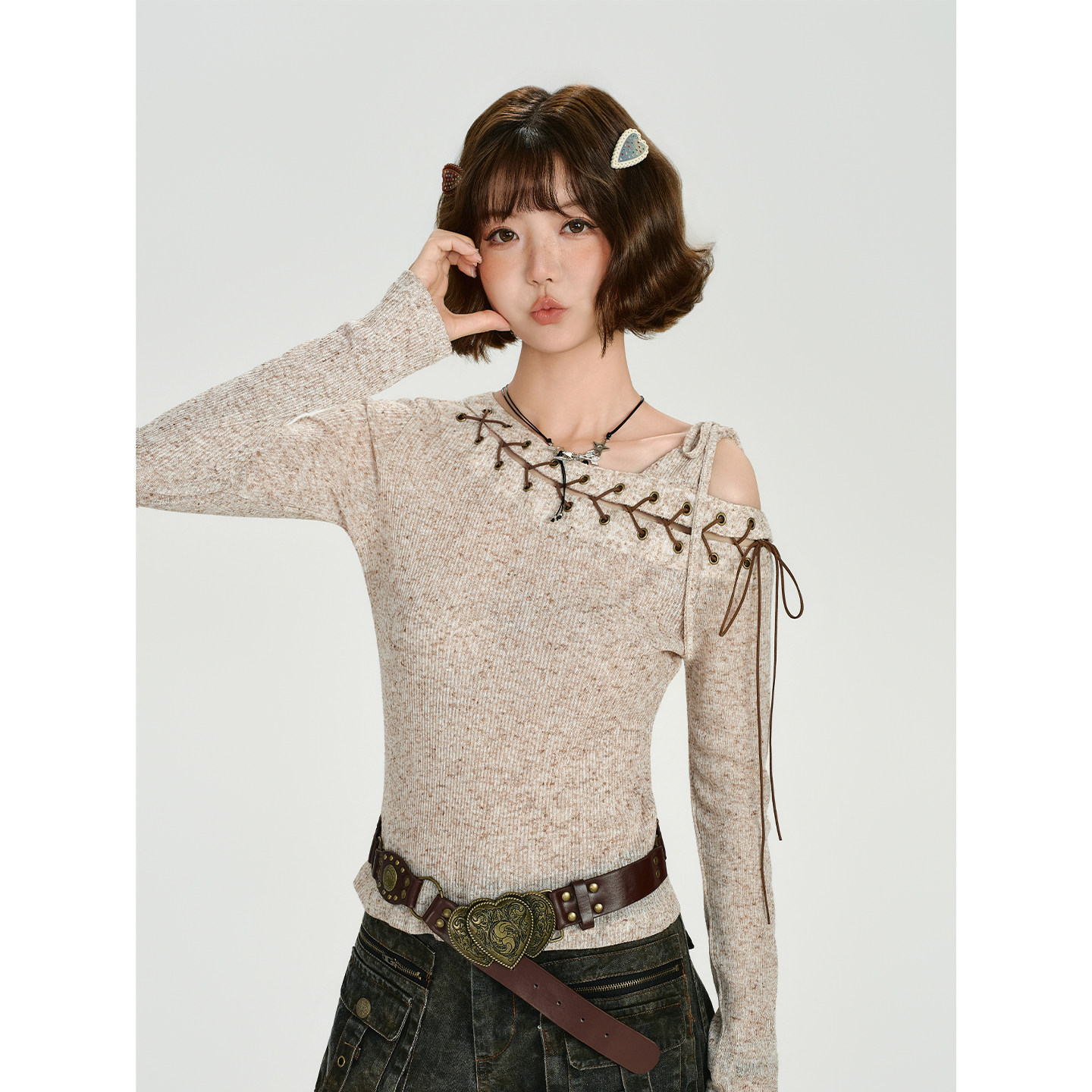 Girlyhalo美式复古辣妹斜肩长袖t恤女秋季新款设计感绑带修身上衣