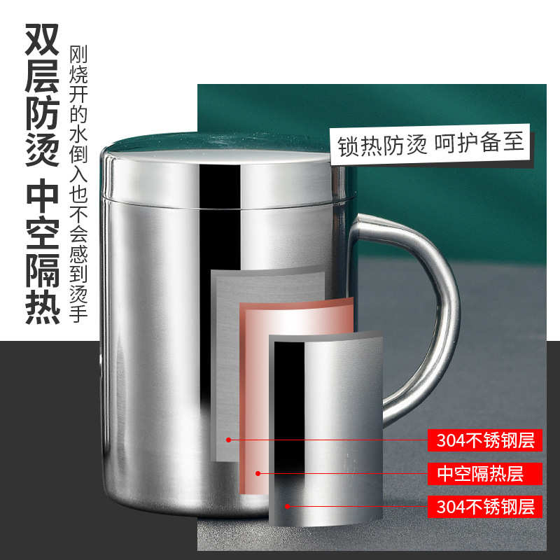 水杯家用304不锈钢带手柄儿童杯子防烫铁杯带盖咖啡马克茶杯口杯