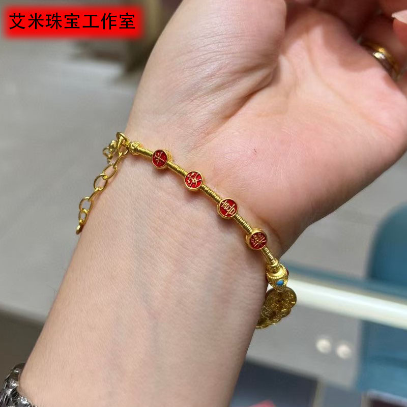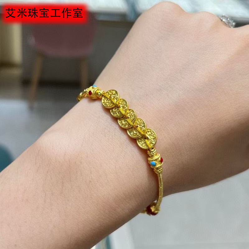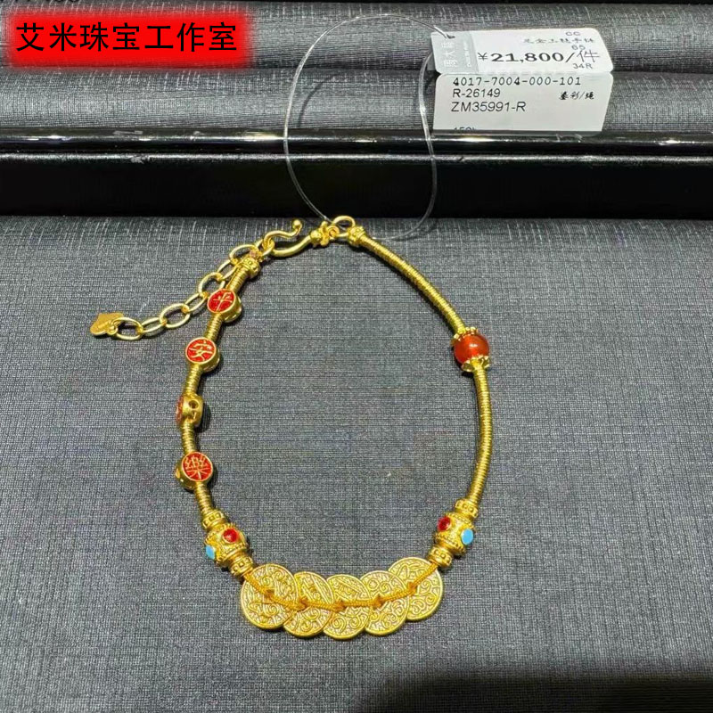 大陆周大福传承999足金盘缠玉髓黄金平安喜乐五帝钱碎金手链女款