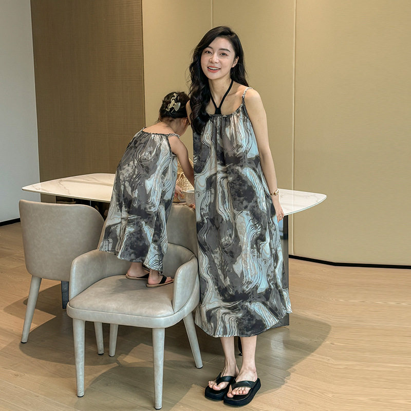 情侣装夏季2024新款海边度假沙滩衬衫吊带假两件连衣裙洋气亲子装