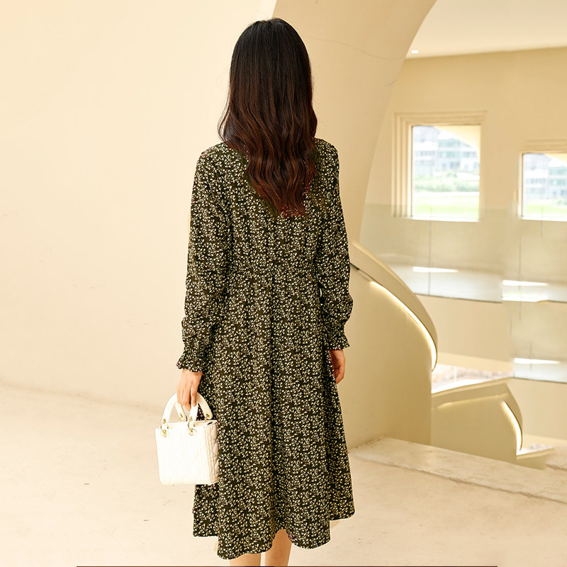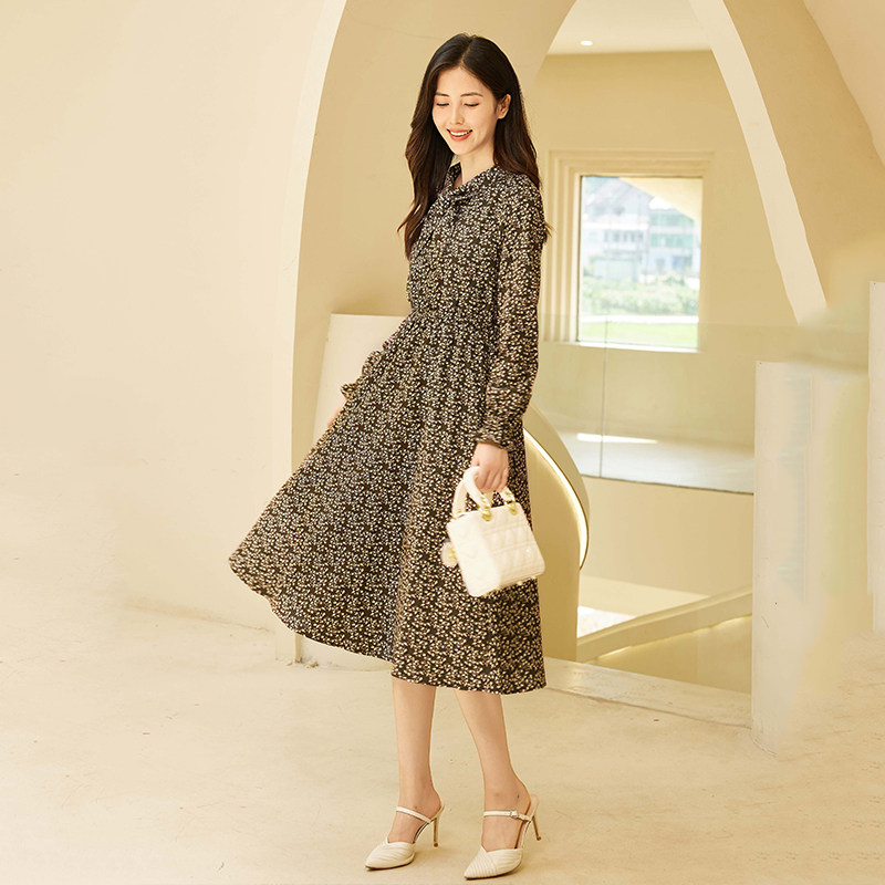 Lucidy/鲁思蒂碎花连衣裙女2024春季新品通勤简约长袖中长款A字裙