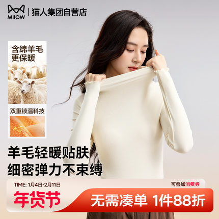 猫人羊毛保暖上衣2025新款女士纯色半高领秋衣打底衫秋冬季厚内搭