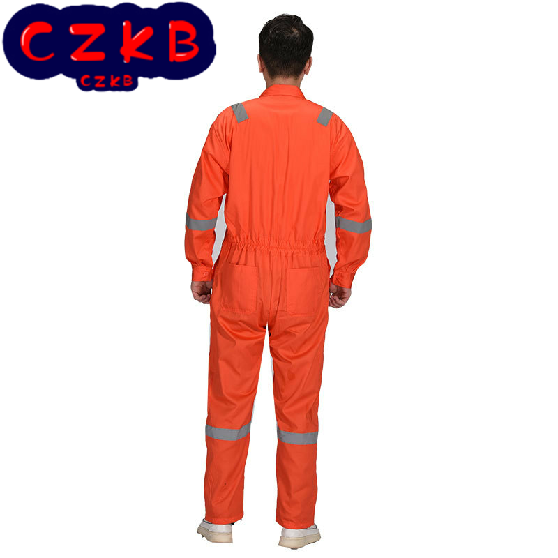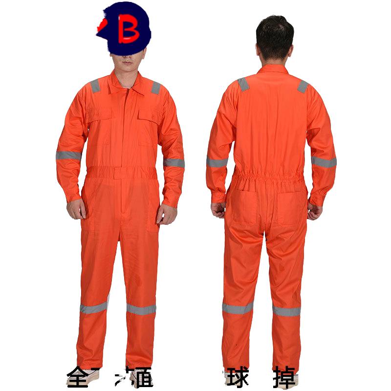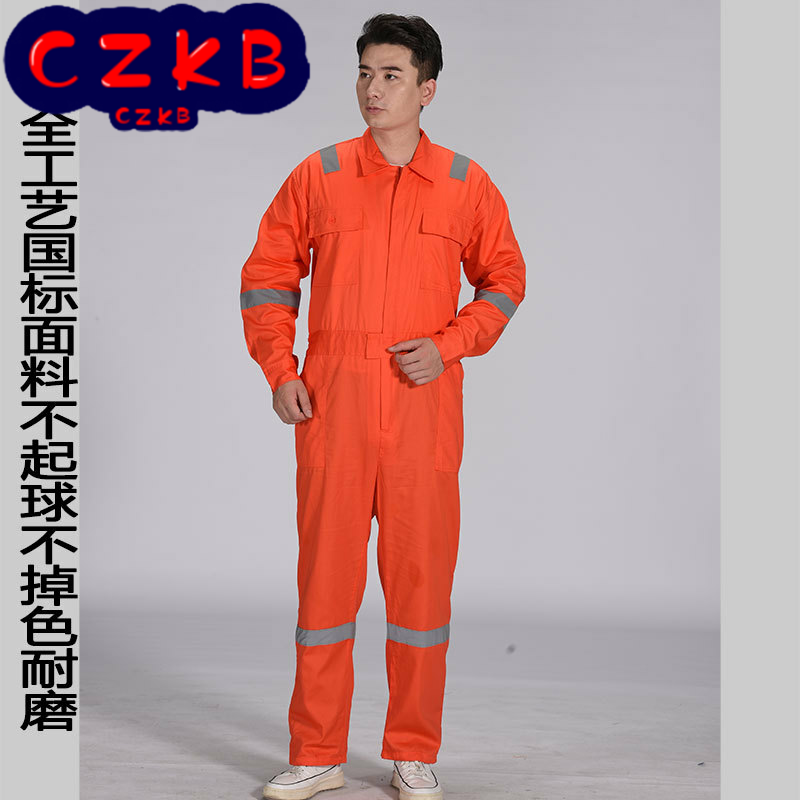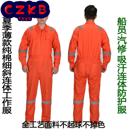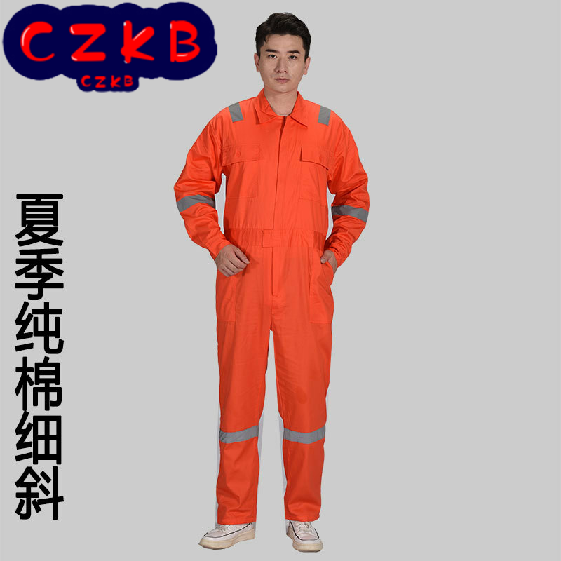 夏季薄款橘红反光条纯棉连体工作服男透气吸汗劳保防护服套装