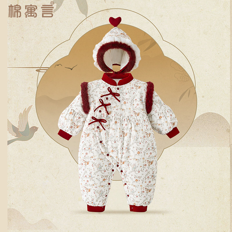 纯棉花婴儿连体衣夹棉宝宝衣服中国风拜年服保暖哈衣冬季外出棉衣