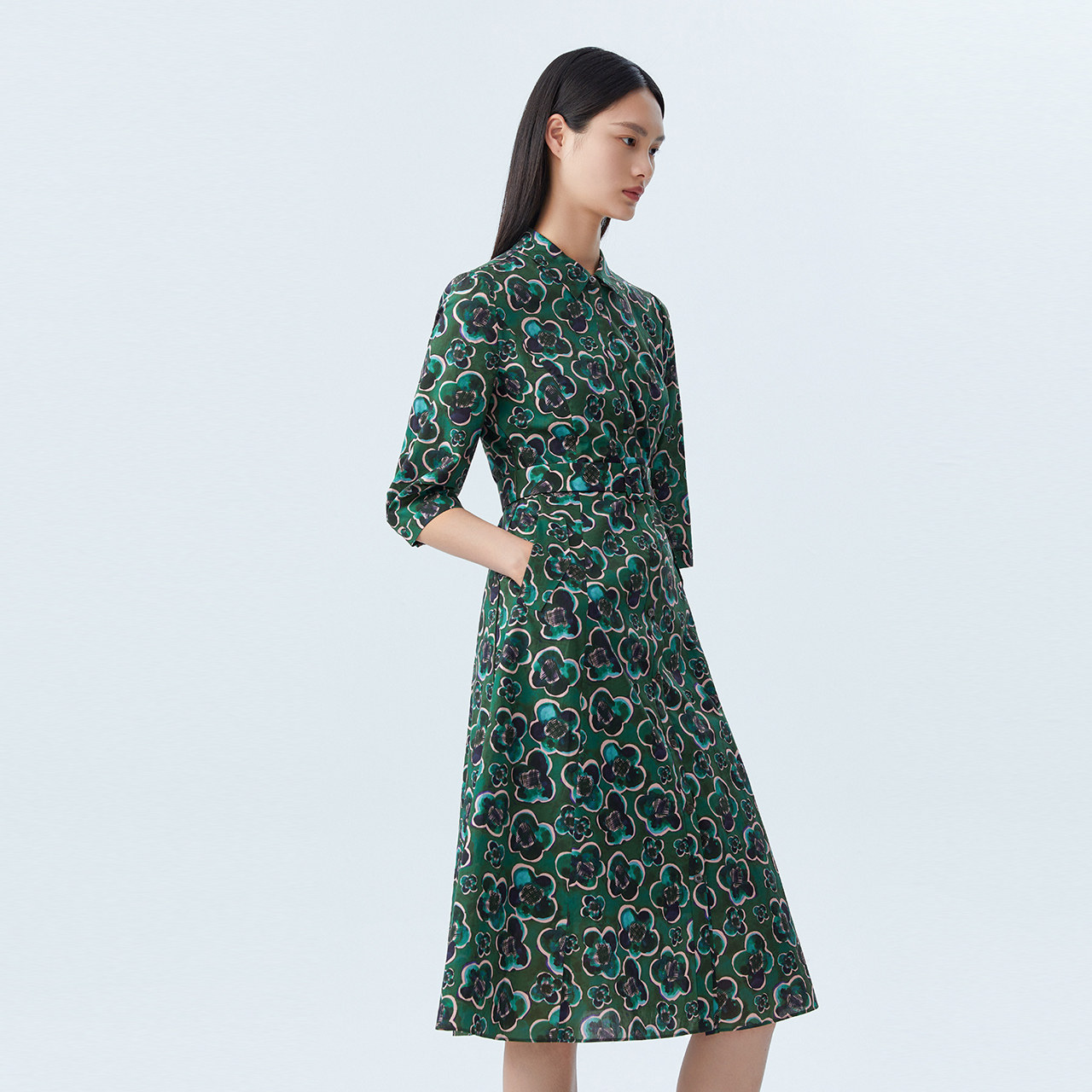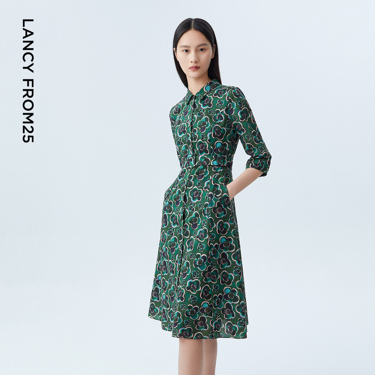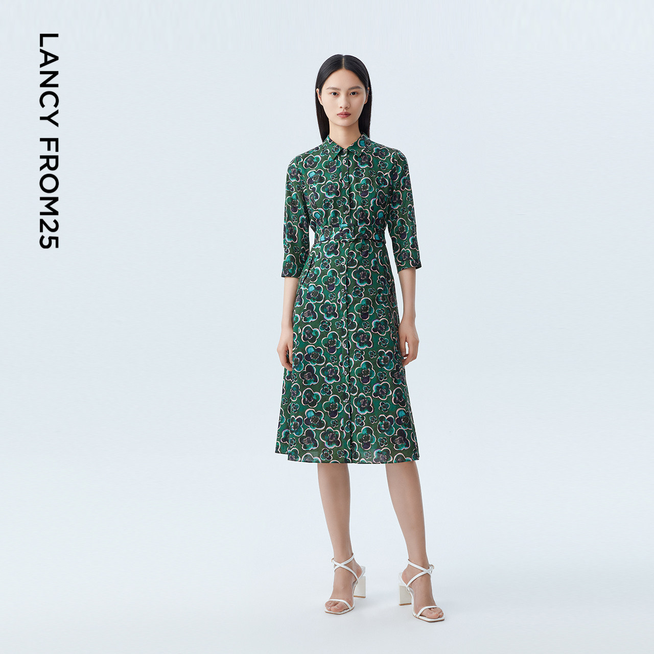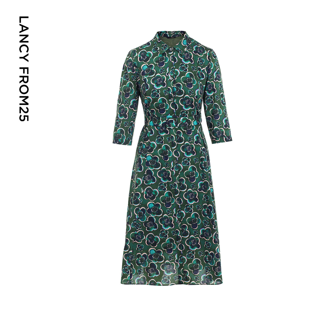 【纯棉】LANCY/朗姿2023早秋新款中长款收腰连衣裙子女碎花裙子