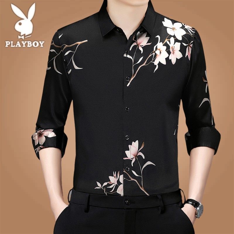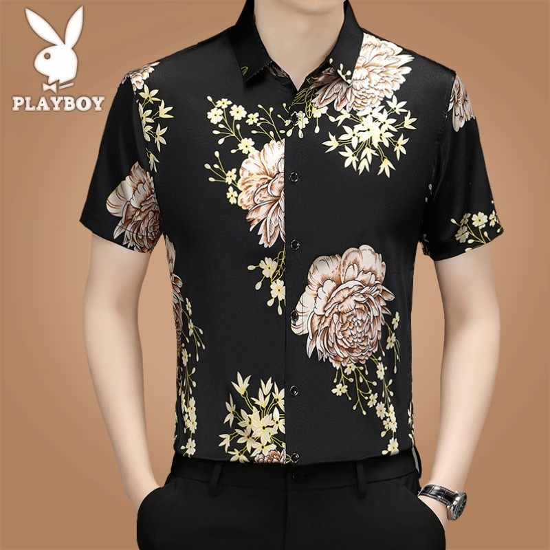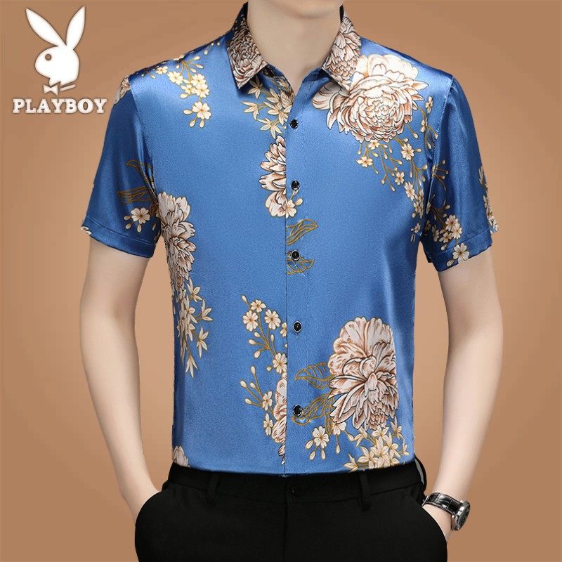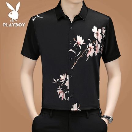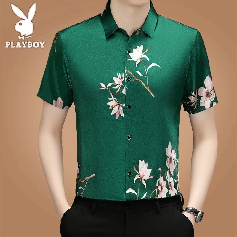 花花公子短袖衬衫男夏季新款桑蚕丝商务休闲免烫抗皱冰丝半袖衬衣