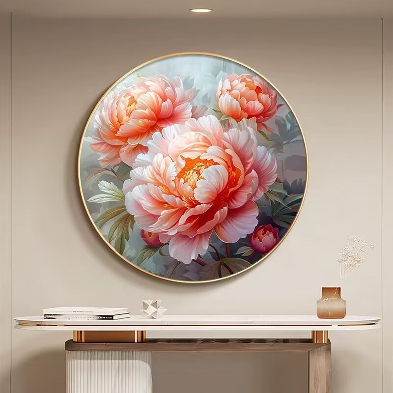 牡丹花圆形玄关挂画新中式花开富贵客厅装饰画餐厅主次卧床头壁画