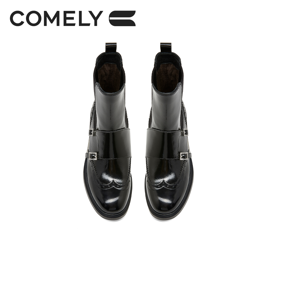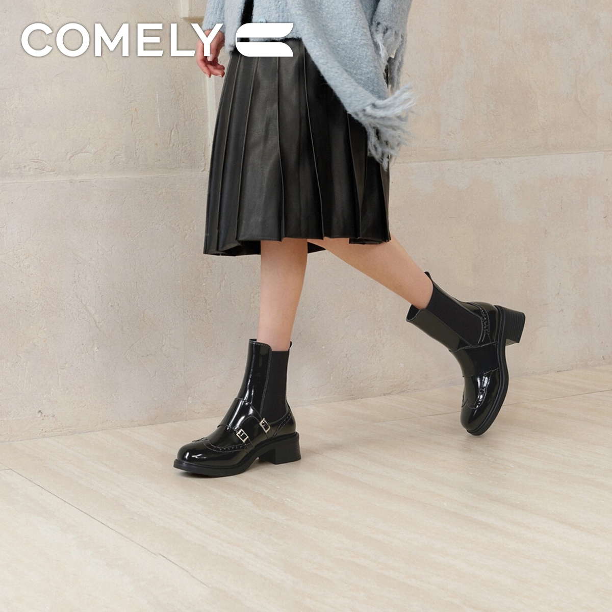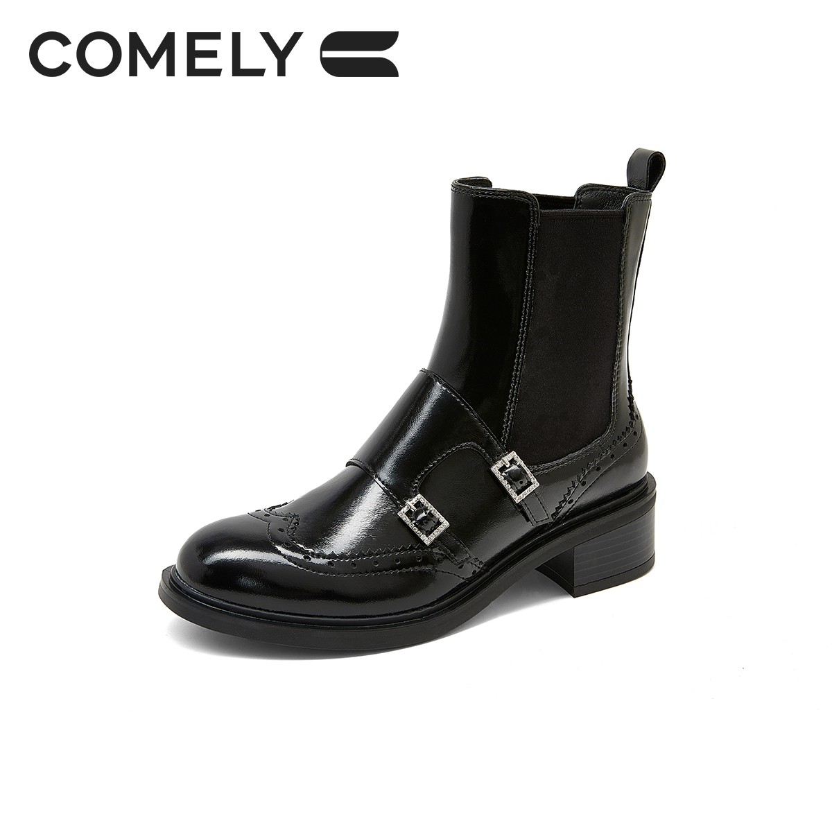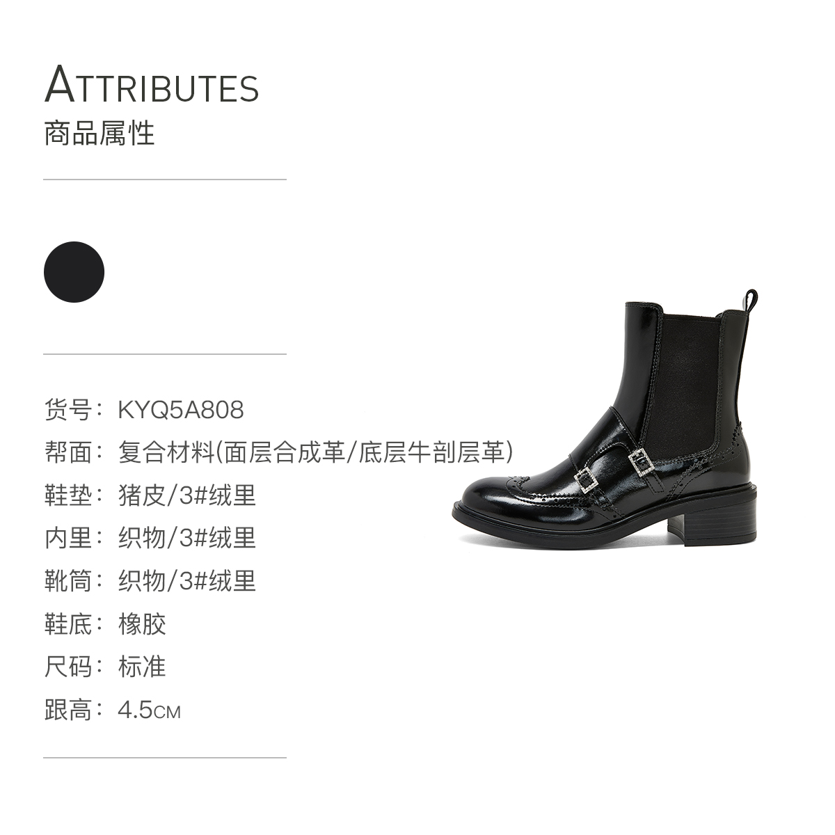 康莉真皮粗高跟短靴女2025年冬季新款牛皮时尚方头棕色靴子时装靴