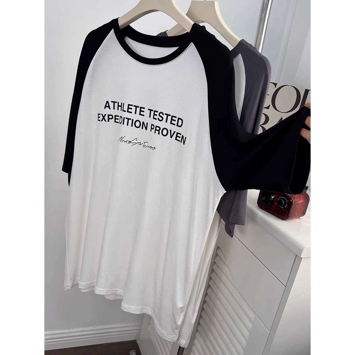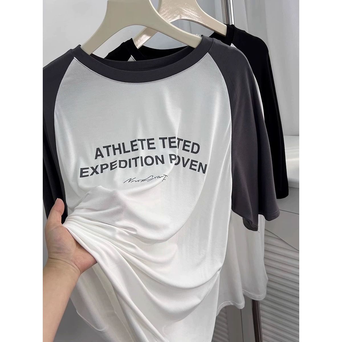 清凉舒适莫代尔拼色短袖t恤女夏季薄款宽松慵懒风中长款半袖上衣