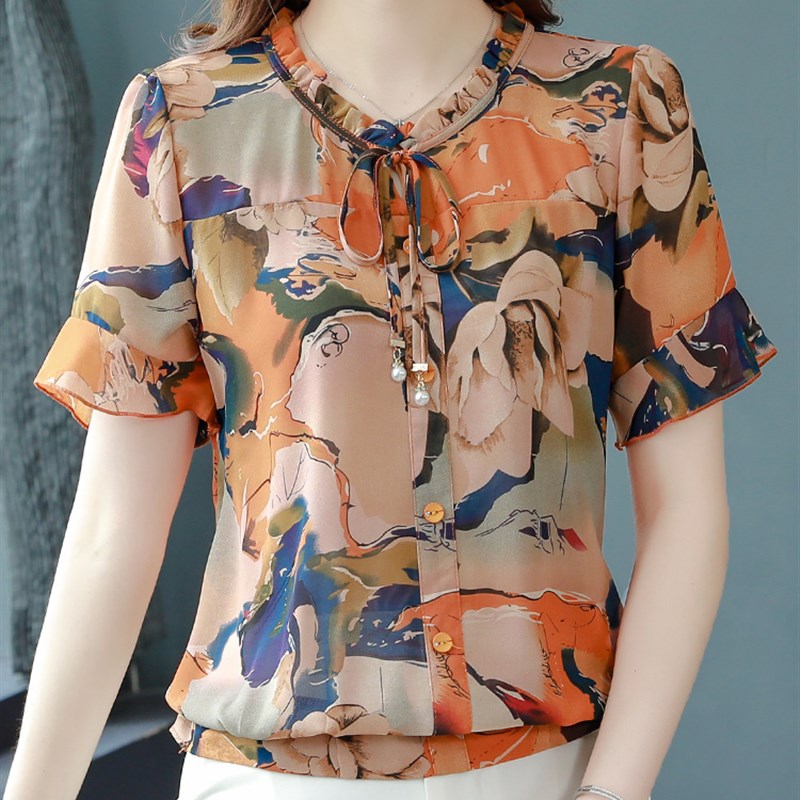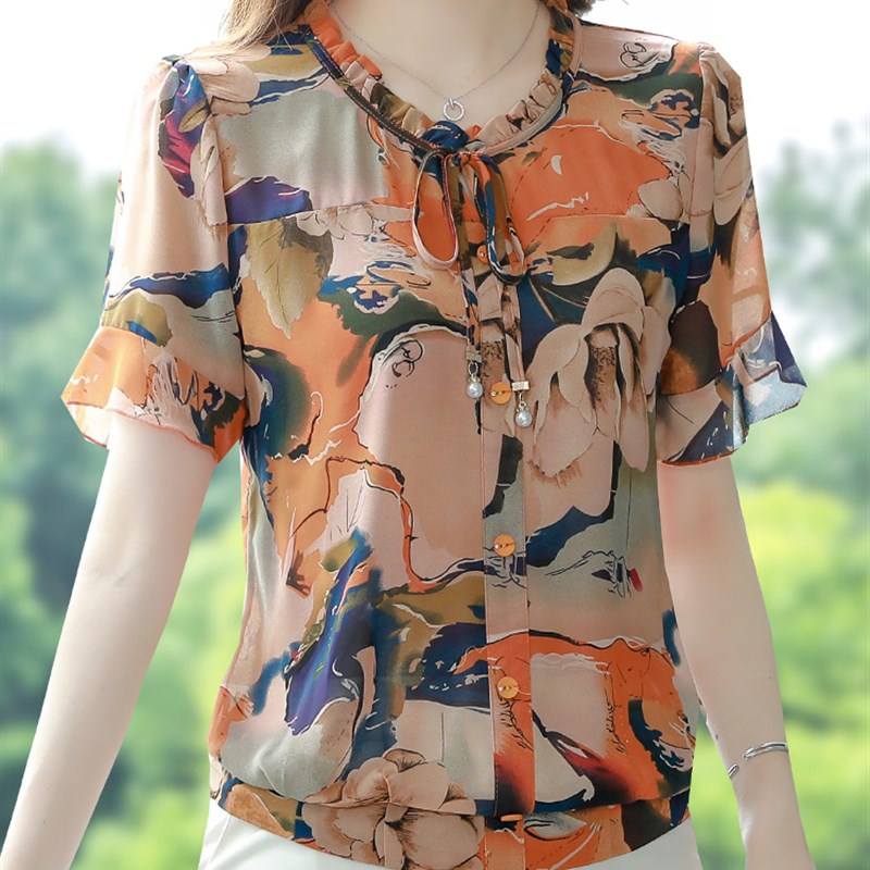妈妈碎花雪纺衫女短袖夏装2024年新款宽松遮肚子中年女士上衣洋气