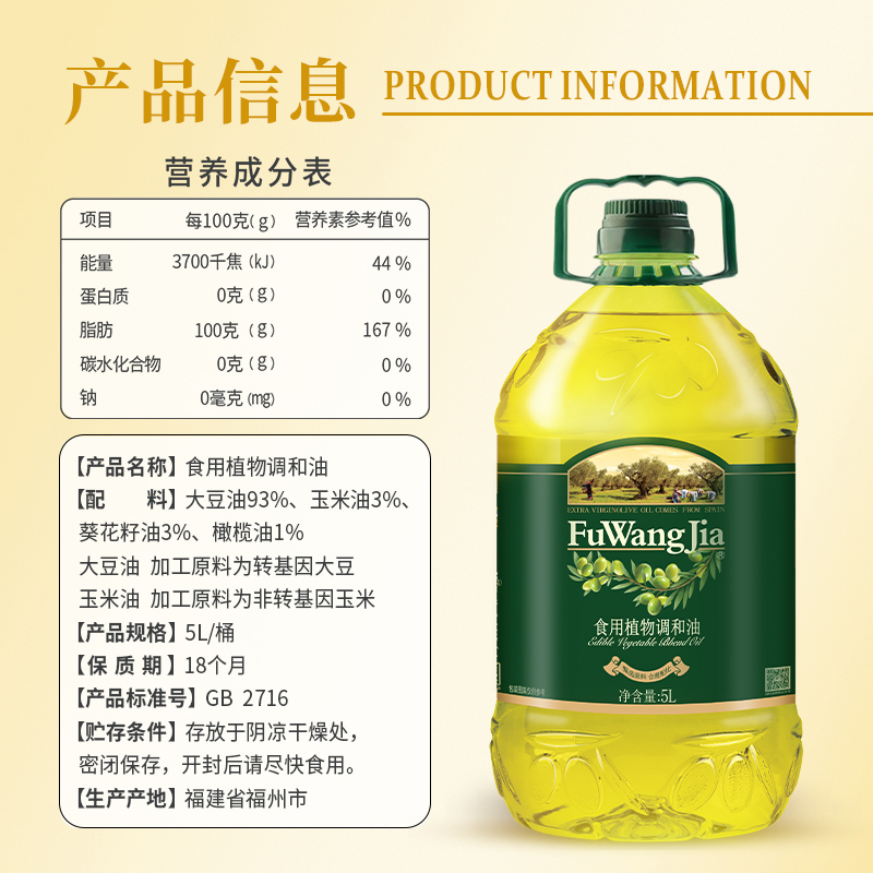 【25年8月生产】福旺家橄榄调和油食用油5L特级初榨家用批发采购