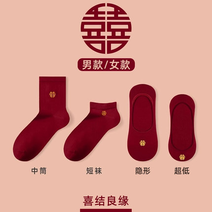 酒红色袜子结婚情侣一对新郎新娘女款男士船袜底隐形薄款大码男款