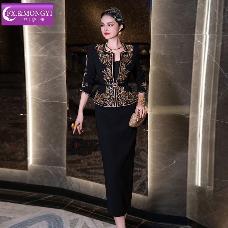 菲梦伊绣花黑色西装套装女秋季重工轻奢高端荷叶边上衣半裙职业装