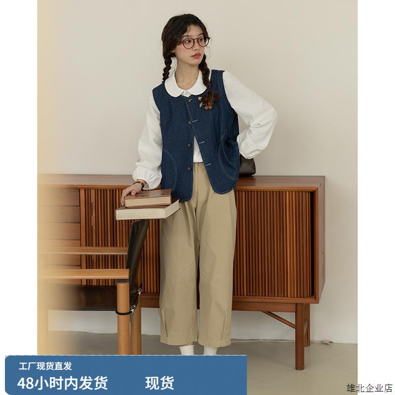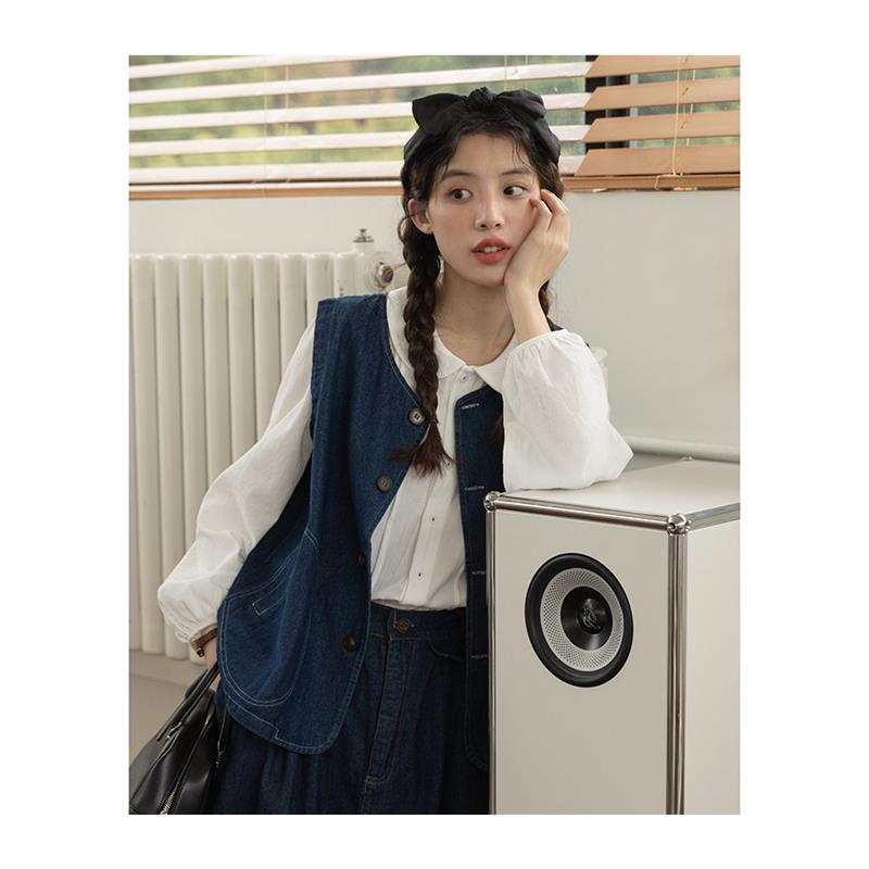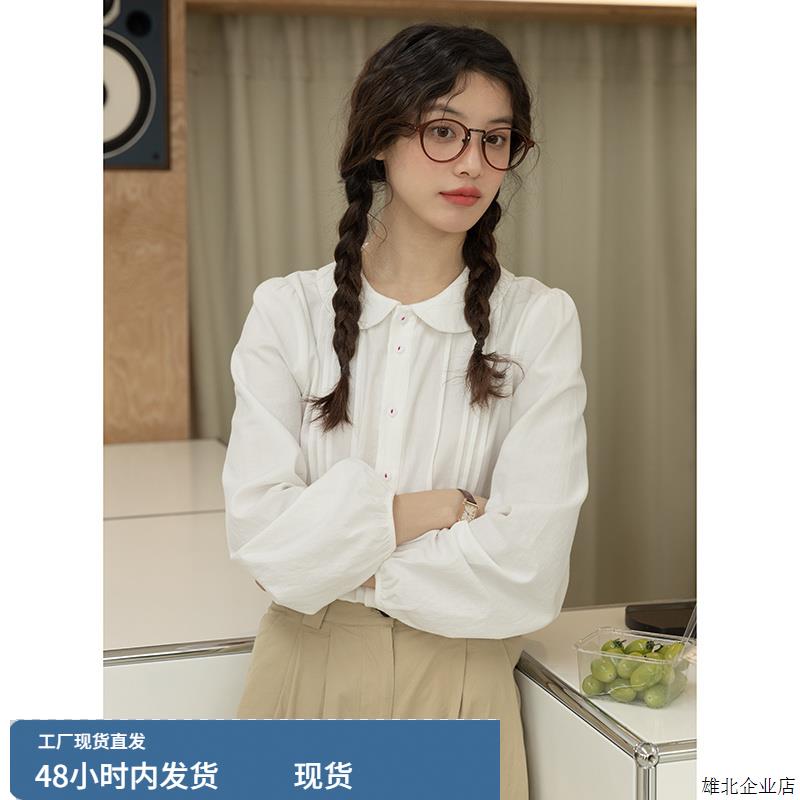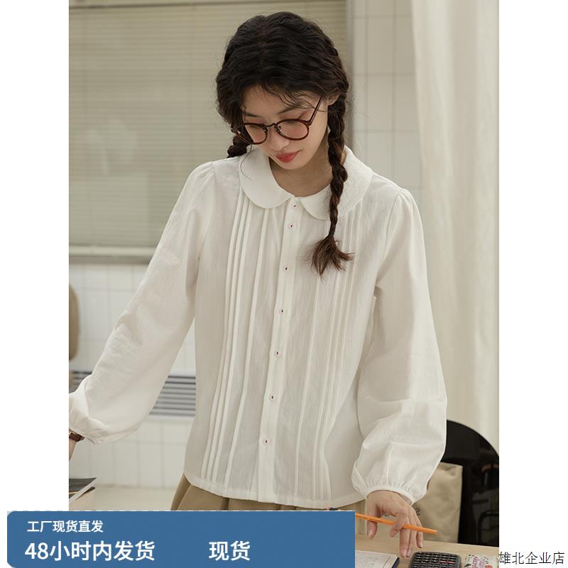 日系文艺娃娃领衬衫女春秋法式复古设计感压褶长袖白色衬衣小清新