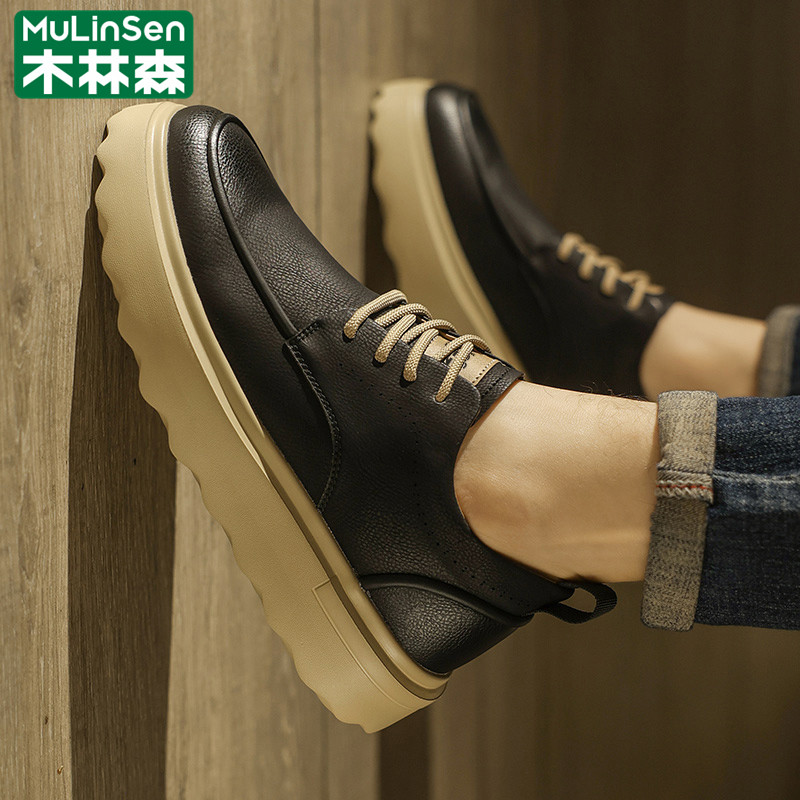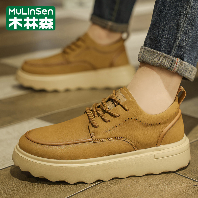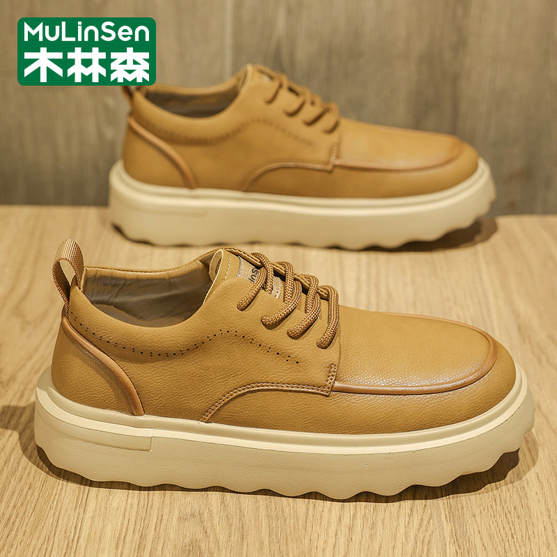 木林森皮鞋男冬季休闲英伦复古工装大头板鞋厚底增高爸爸马丁短靴