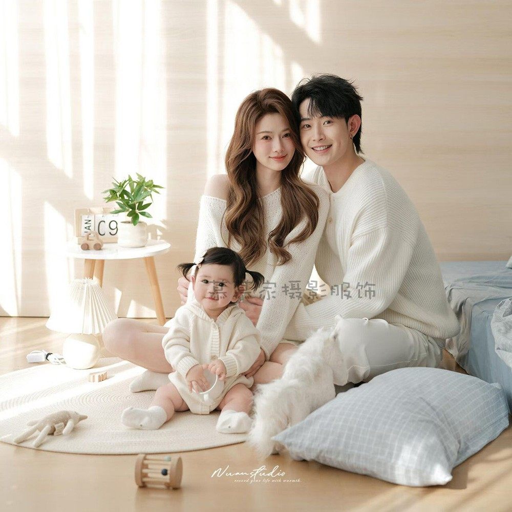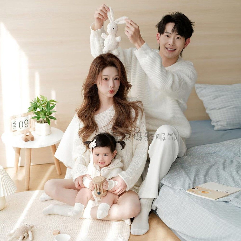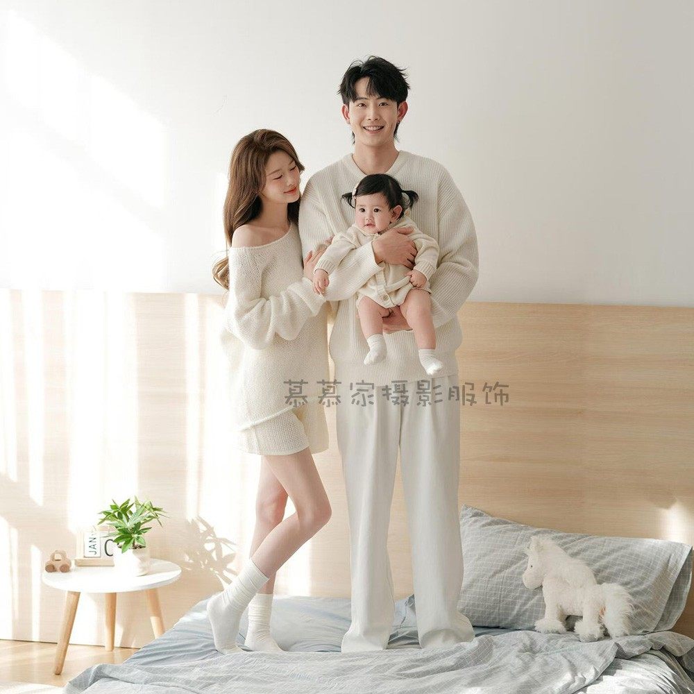 亲子装一家三口简约慵懒风针织毛衣套装白色宽松家居风亲子摄影服