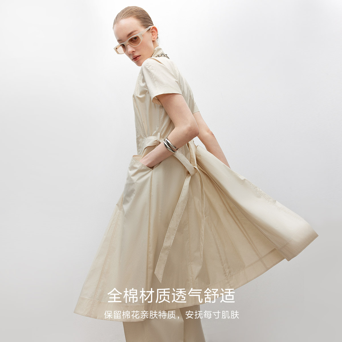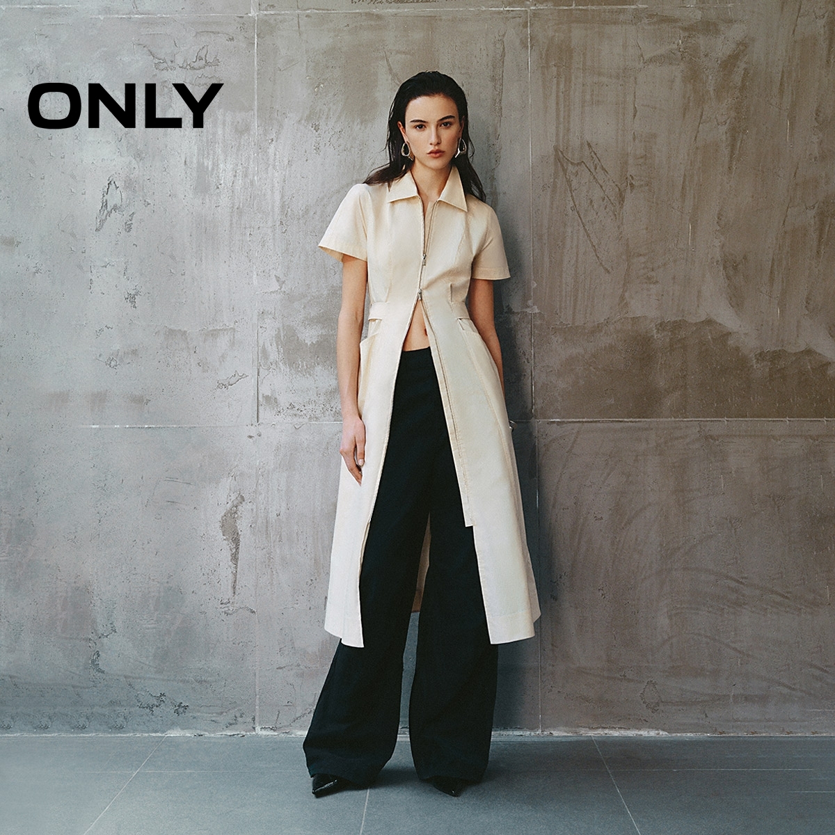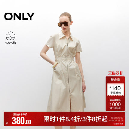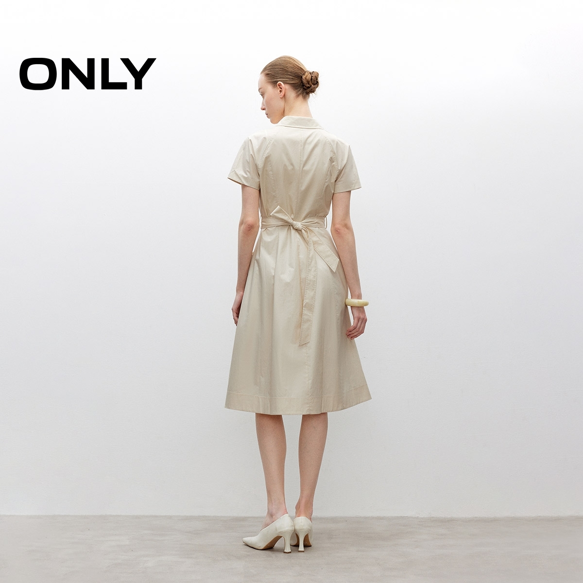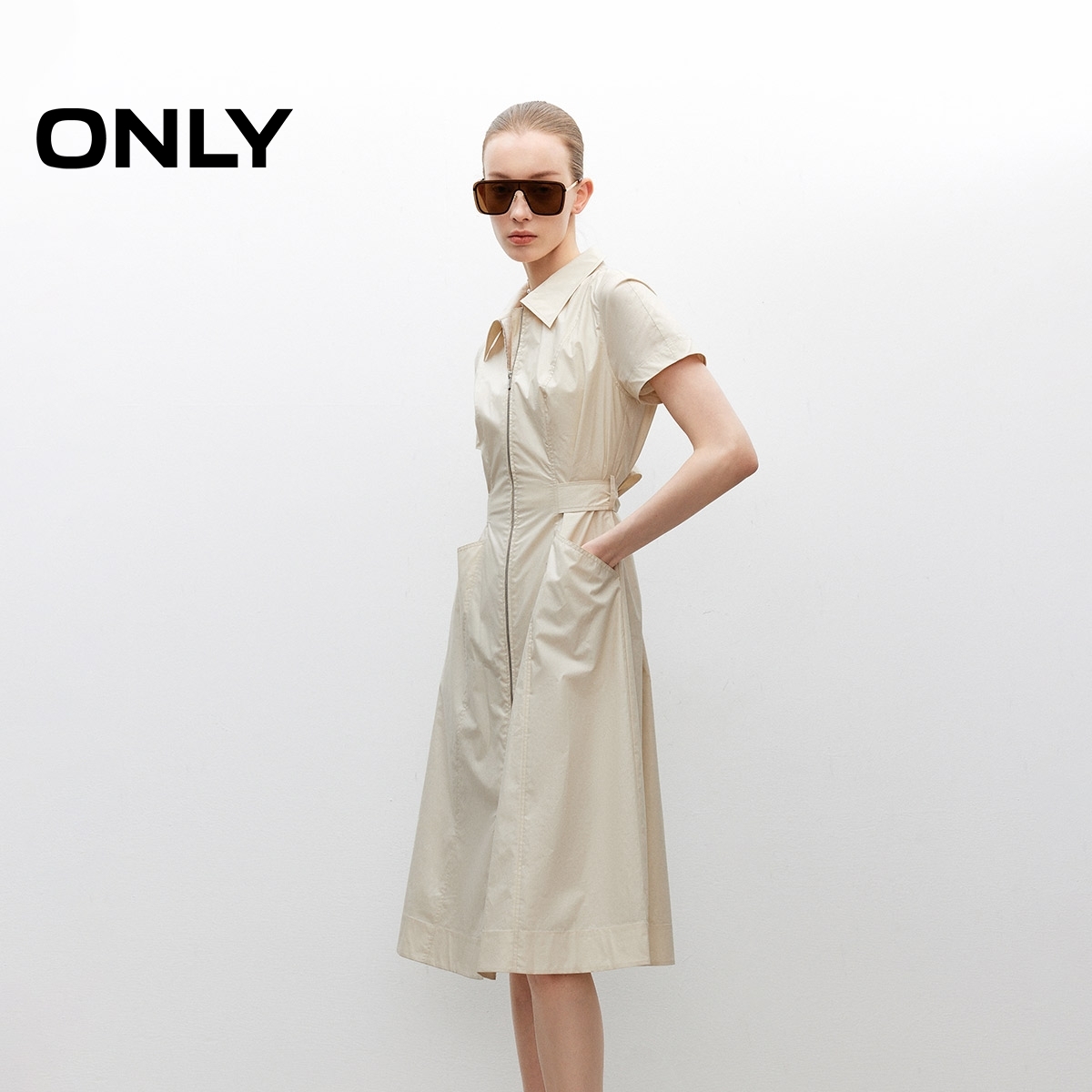 ONLY2025夏季新款收腰绑带双向拉链纯棉翻领A字中长裙连衣裙女