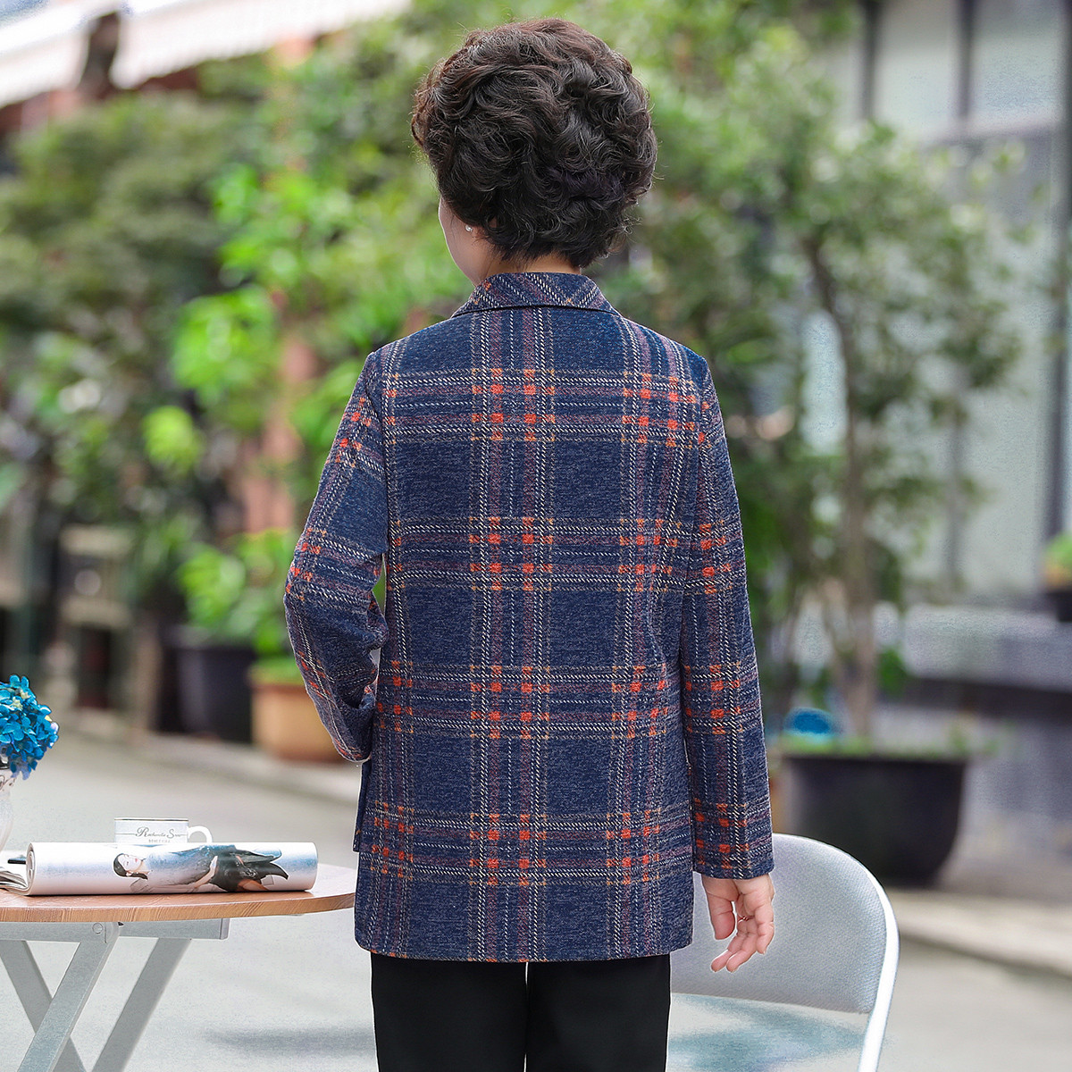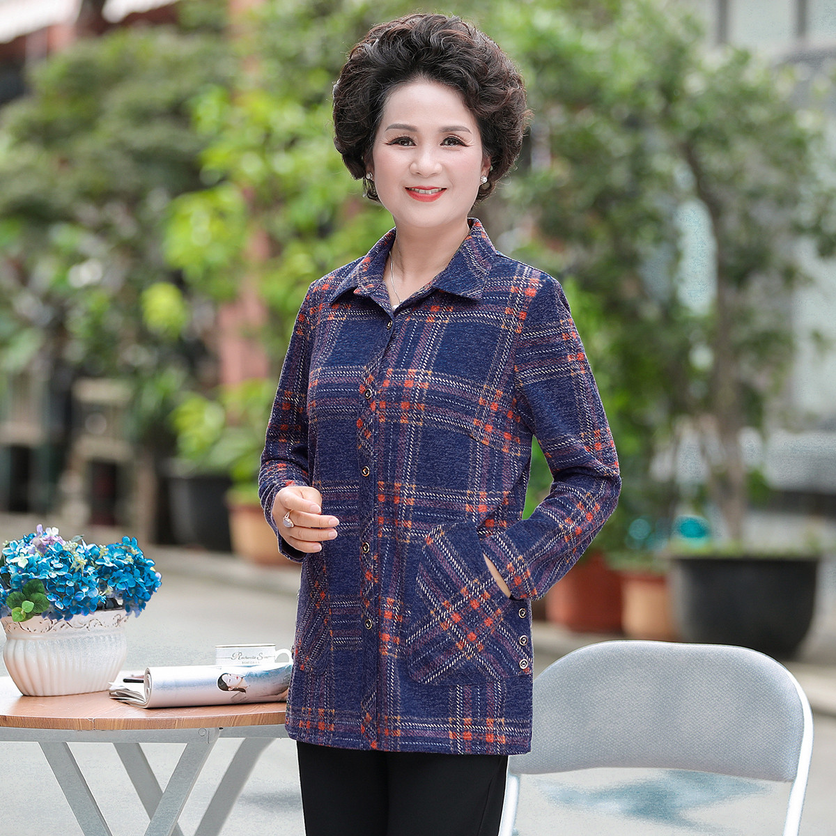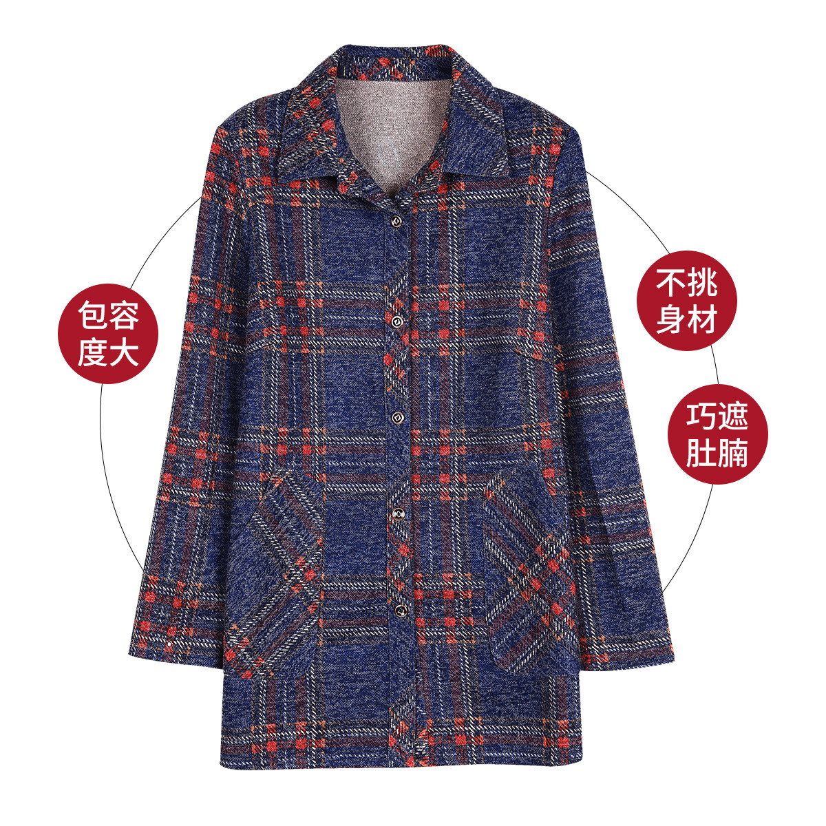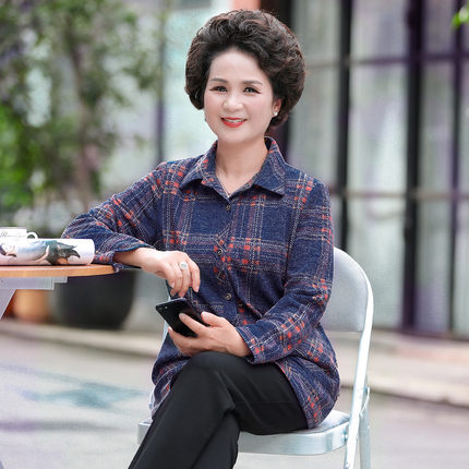 台格长袖衬衫女春秋奶奶装中老年妈妈装翻领垫肩格子休闲衬衣外套