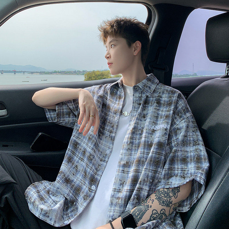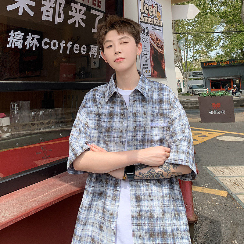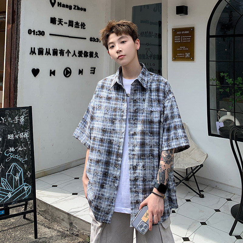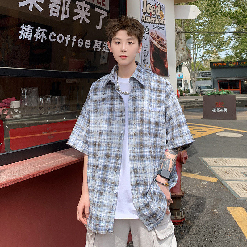 2026夏美式扎染刺绣格子短袖衬衫男女五分袖休闲宽松百搭潮流上衣