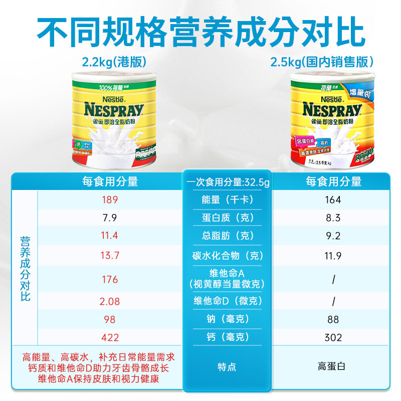 Nestle雀巢港版即溶全脂奶粉高蛋白高钙进口全家营养牛奶粉2200克