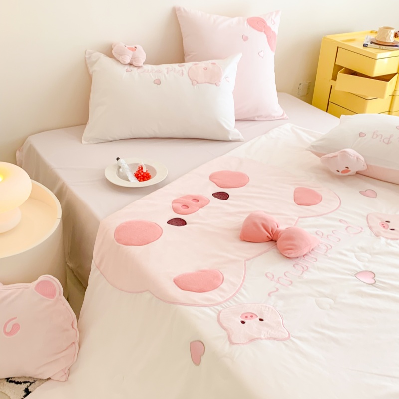 可爱少女心猪猪水洗棉夏凉被四件套儿童女孩刺绣空调被薄被子夏季