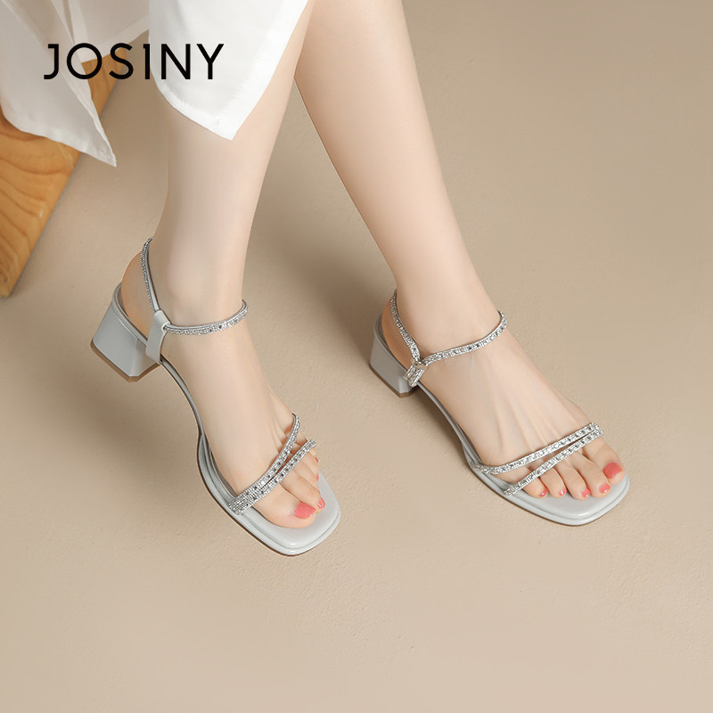 卓诗尼水钻一字带凉鞋女2026春季新款粗跟仙女风配裙子百搭高跟鞋