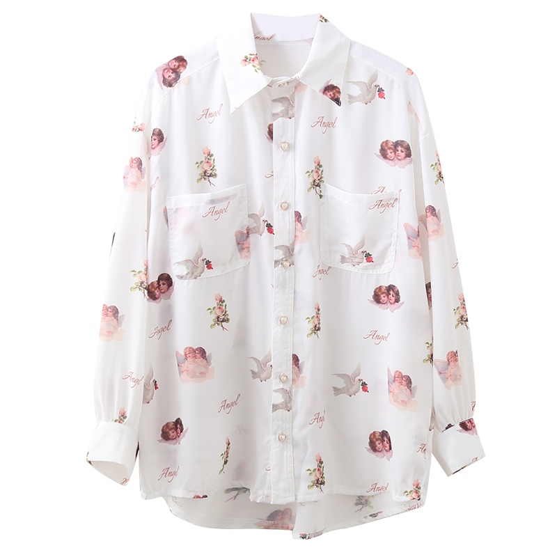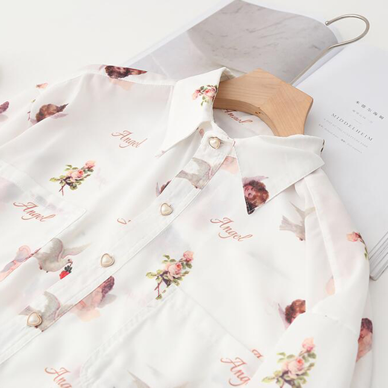 特价/日系灯笼袖天使印花BF风复古港味少女衬衣上衣长袖雪纺衬衫
