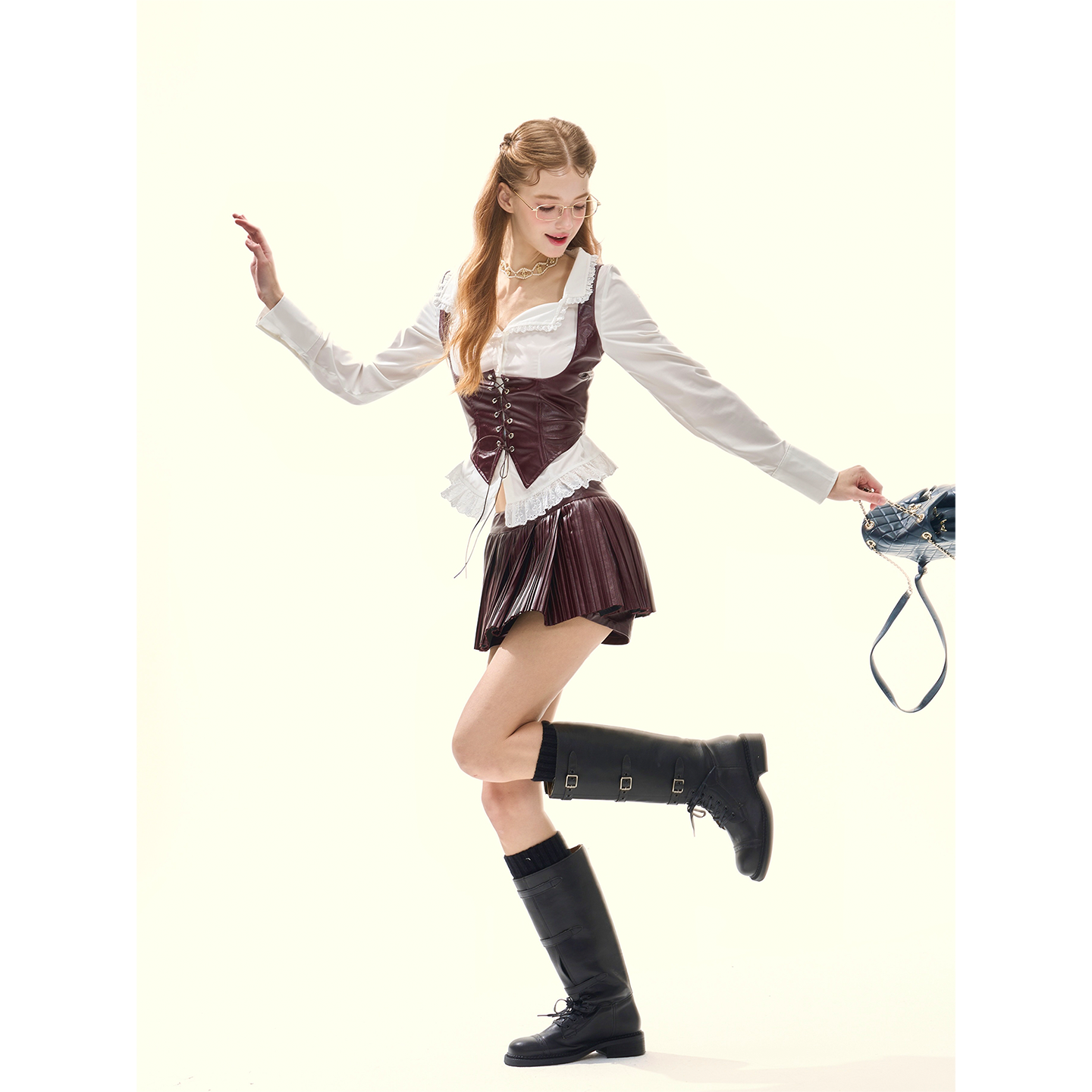 GirlyFancyClub糖心巧克力*复古系带束腰马甲背心百褶裙裤皮套装