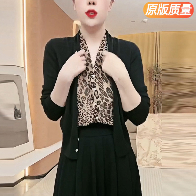 早秋针织开衫豹纹真丝衬衫女长袖秋冬新款妈妈毛衣打底假两件上衣