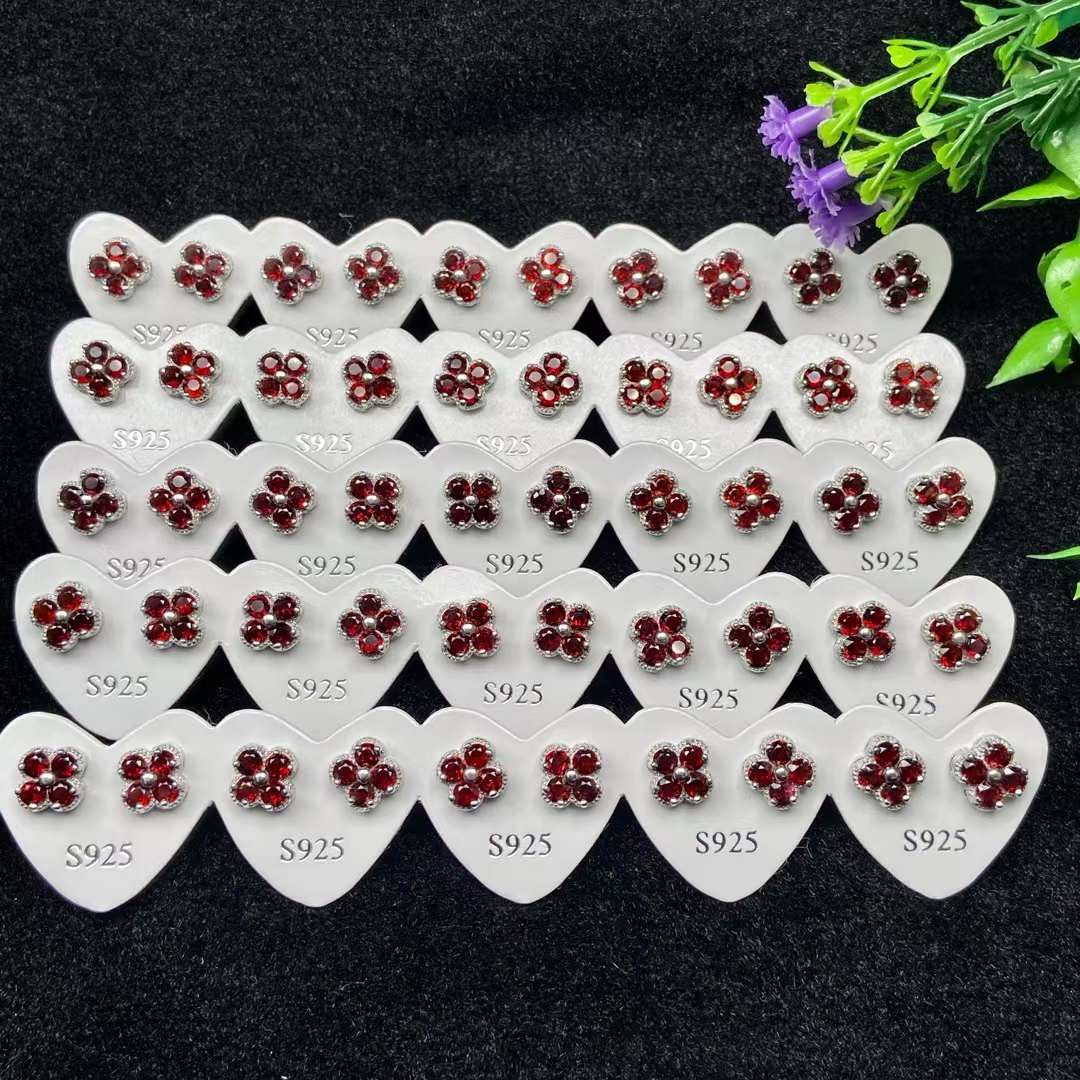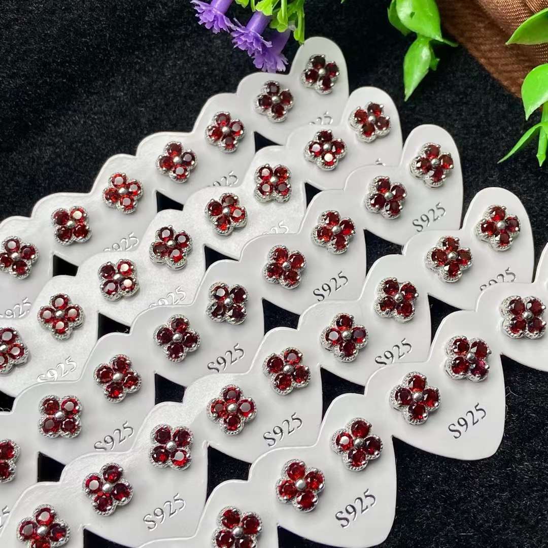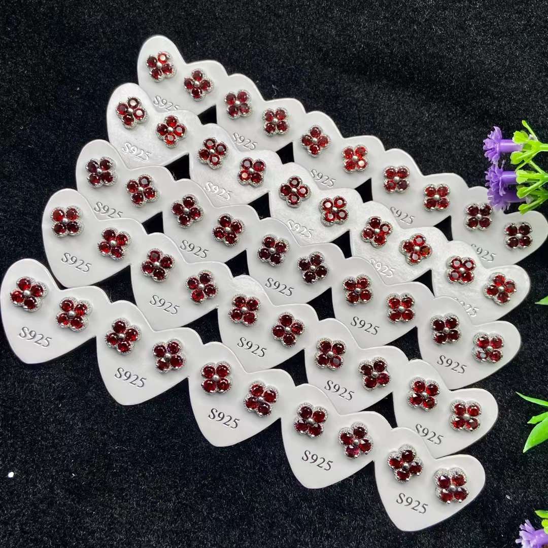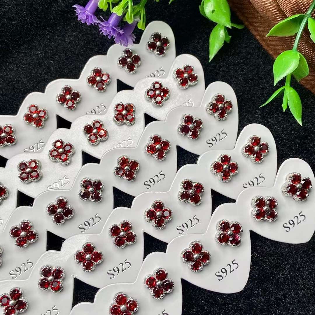 S925银针天然切角石榴石四叶草耳钉新潮款轻奢小众气质女饰品