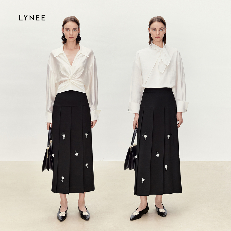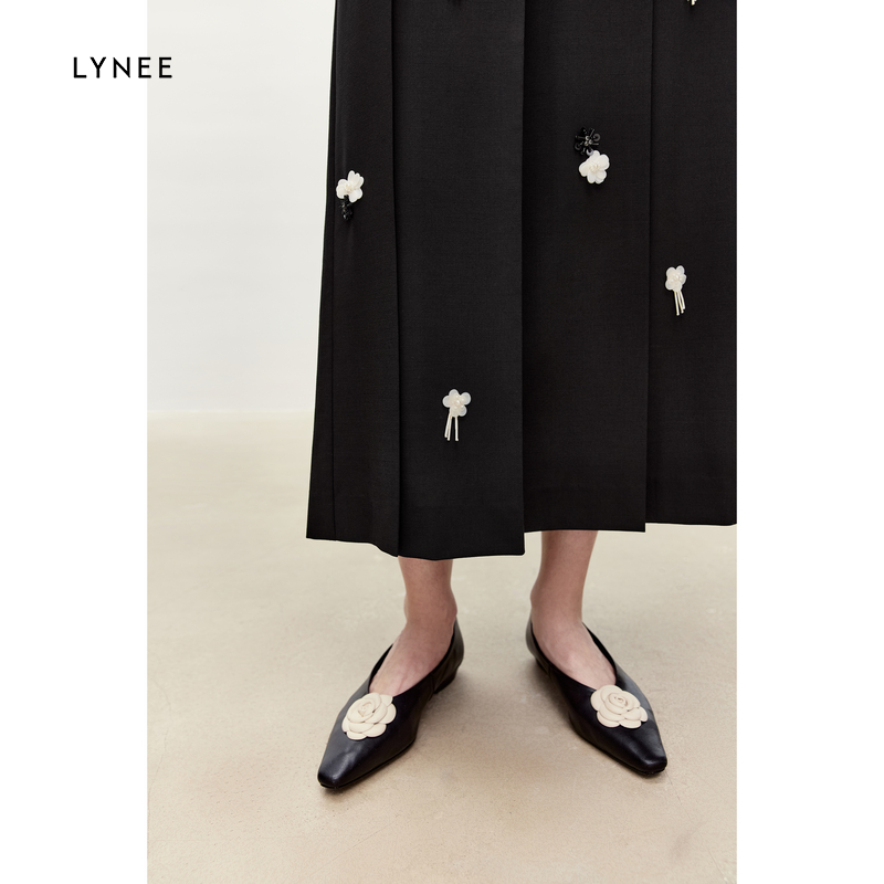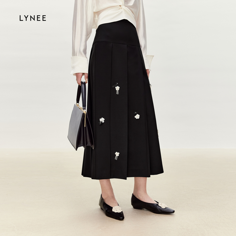 LYNEE 手工珠片花朵高腰A字半身裙女夏季新款休闲显瘦百褶裙