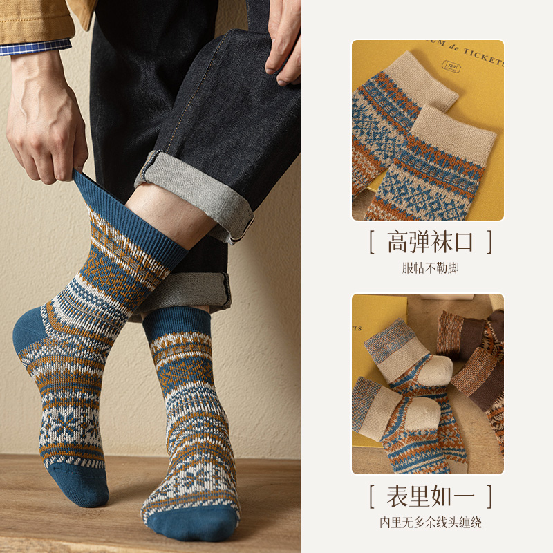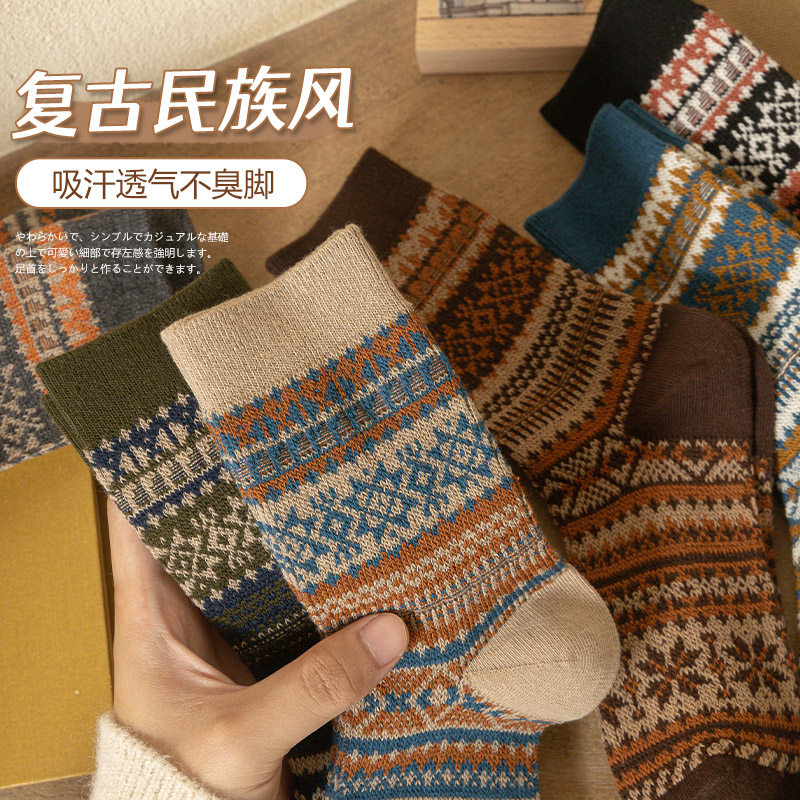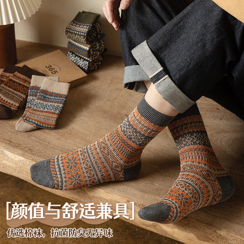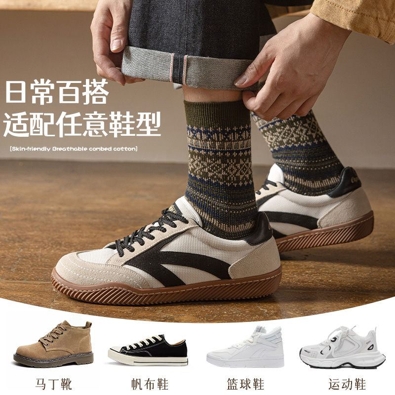 袜子男春秋季棉袜中筒吸汗防臭ins潮复古民族风双针双路外穿长袜