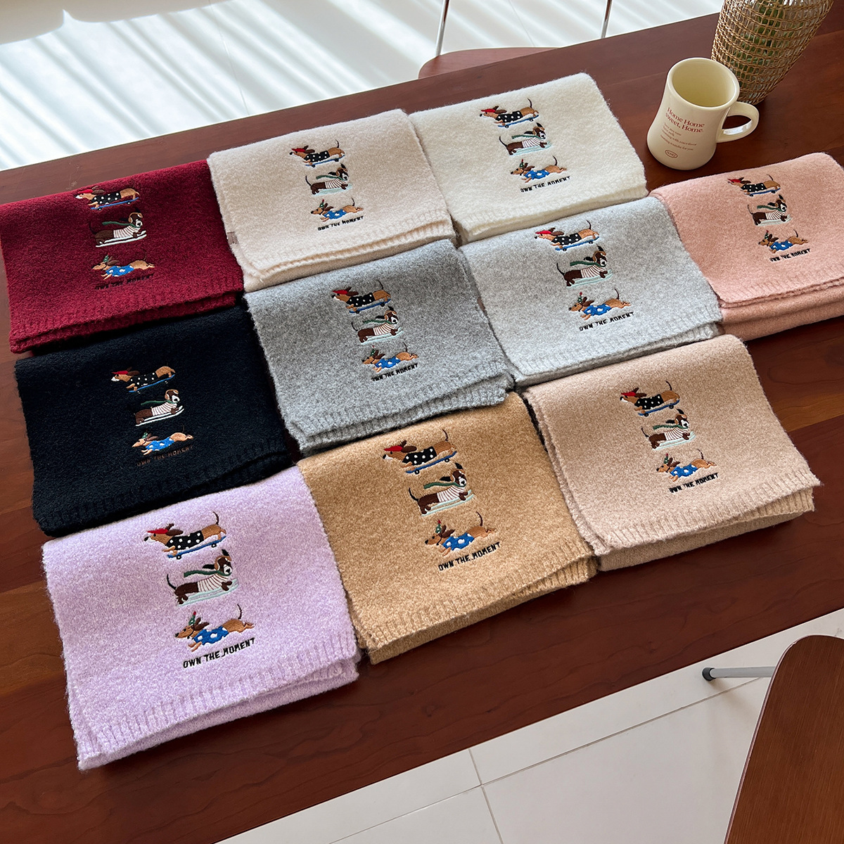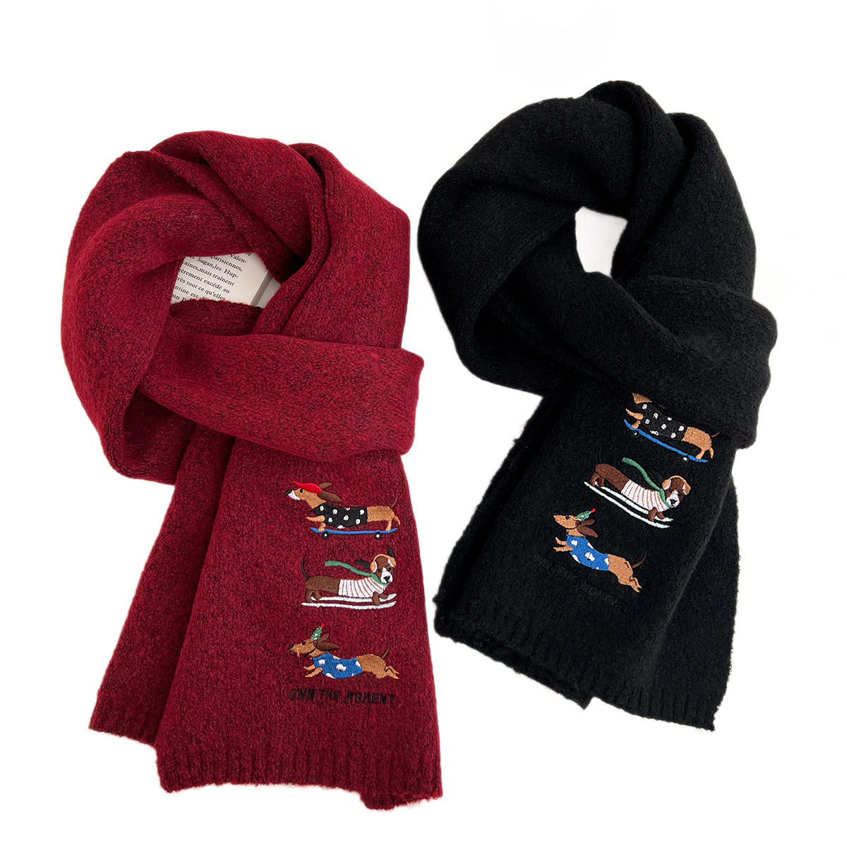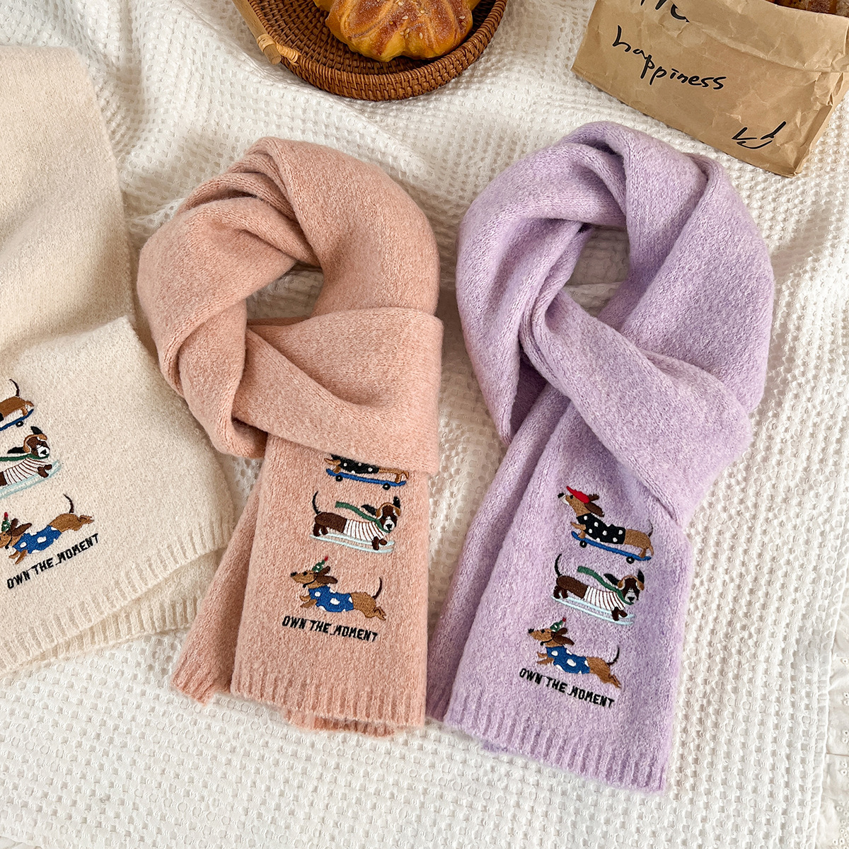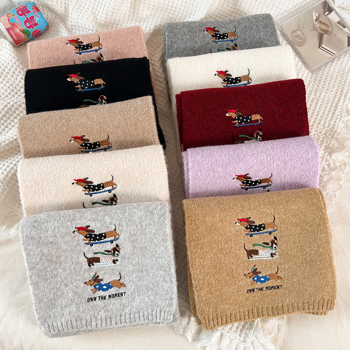 含羊毛可爱刺绣腊肠狗针织围巾男女秋冬保暖毛线百搭学生情侣围脖