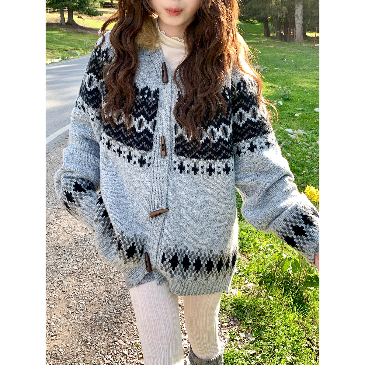 钟一诺 费尔岛提花可拆卸毛领开衫毛衣女秋冬慵懒风保暖针织外套