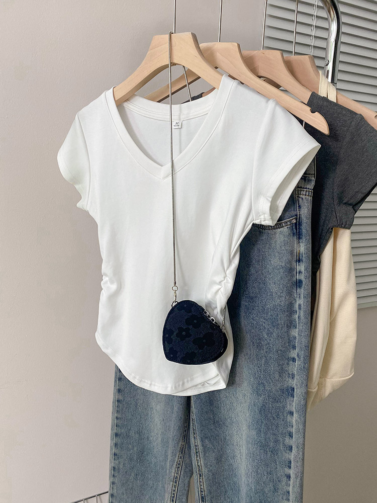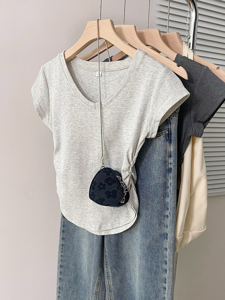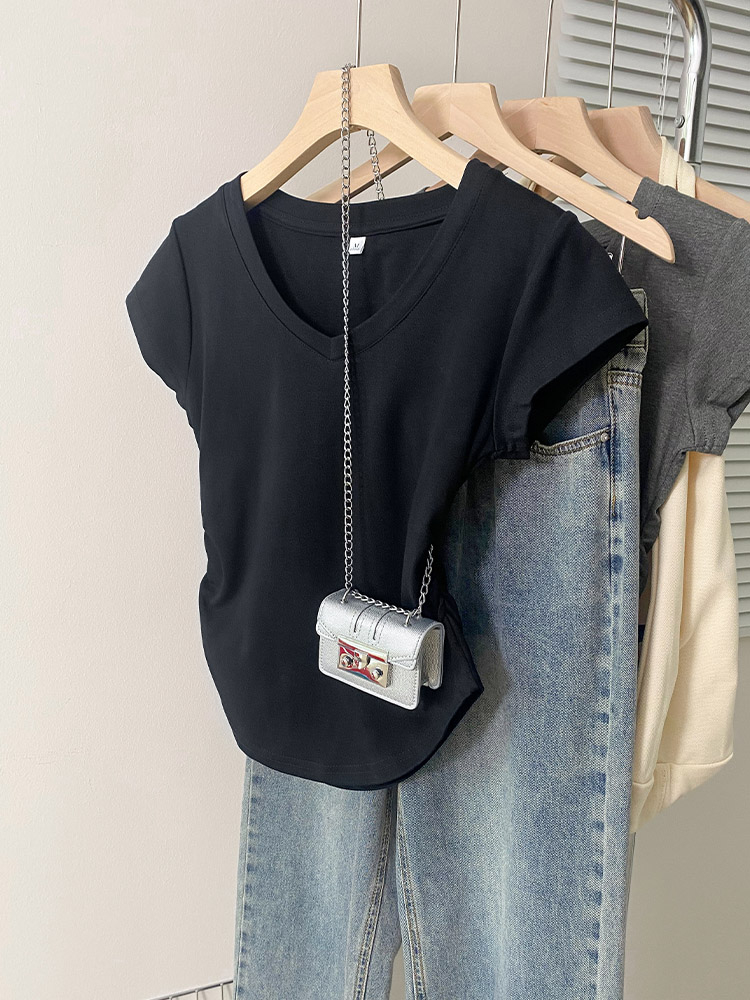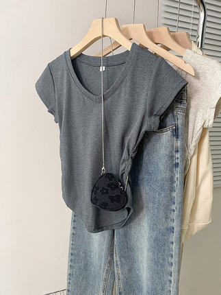 设计感气质别致纯棉v领T恤女短袖短款打底正肩显瘦修身小众上衣夏