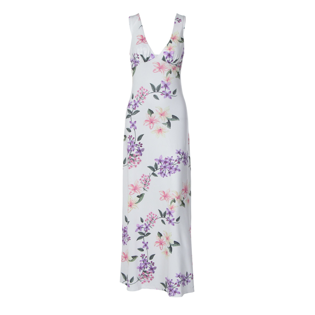 度假风花卉印花V领无袖连衣裙