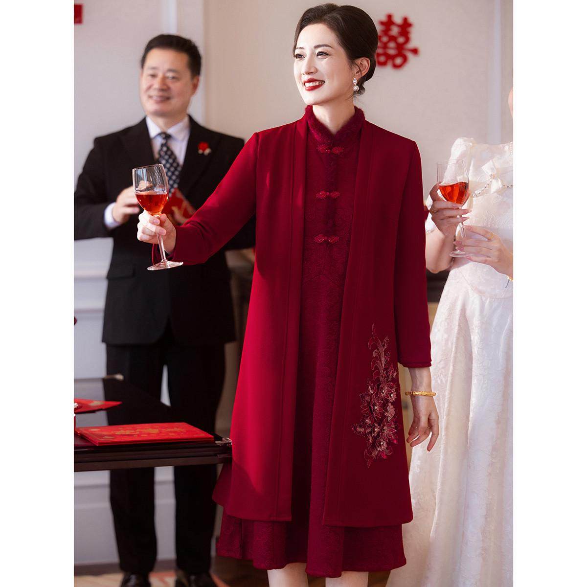 【喜婆婆系列】春秋国风套装连衣裙+中长款外套妈妈婚宴家宴礼服