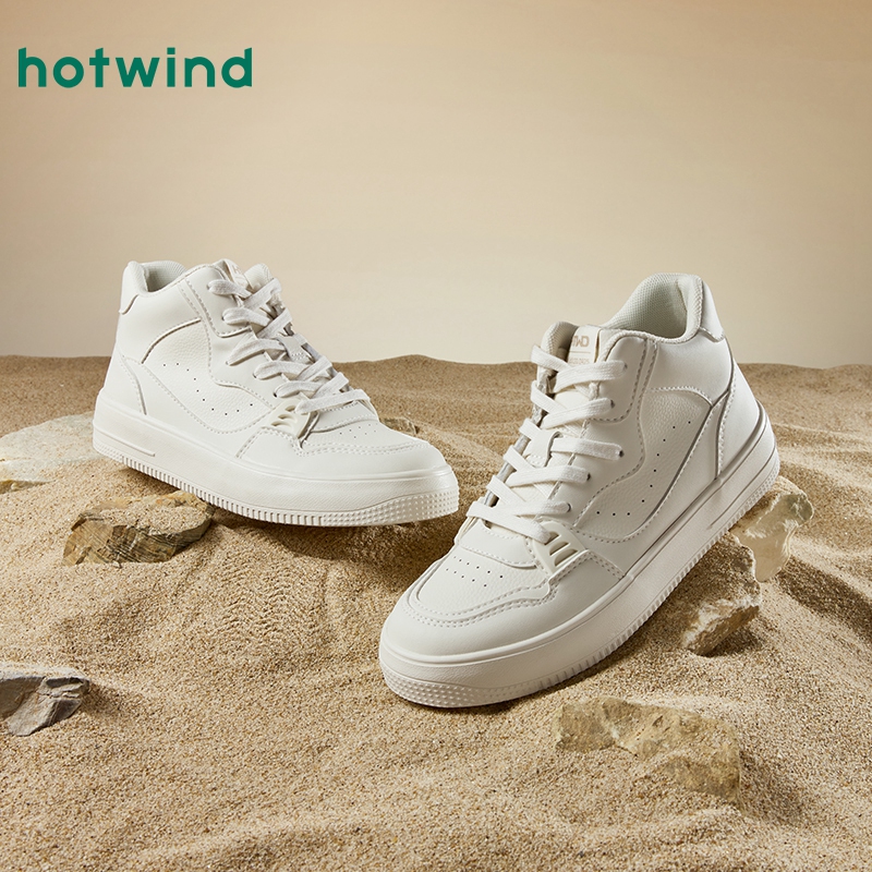 热风秋季新款女士时尚圆头系带休闲鞋透气舒适拼色高帮板鞋
