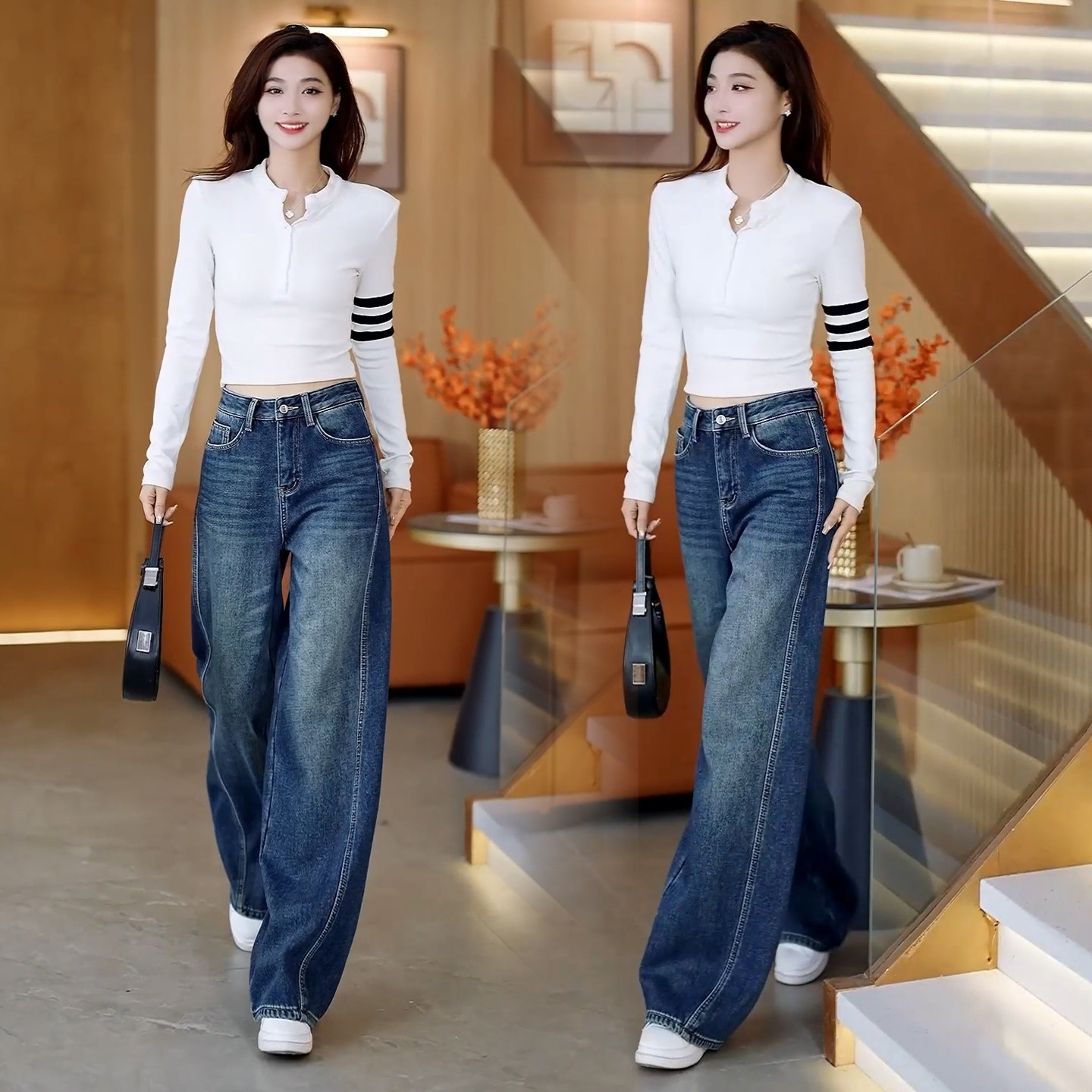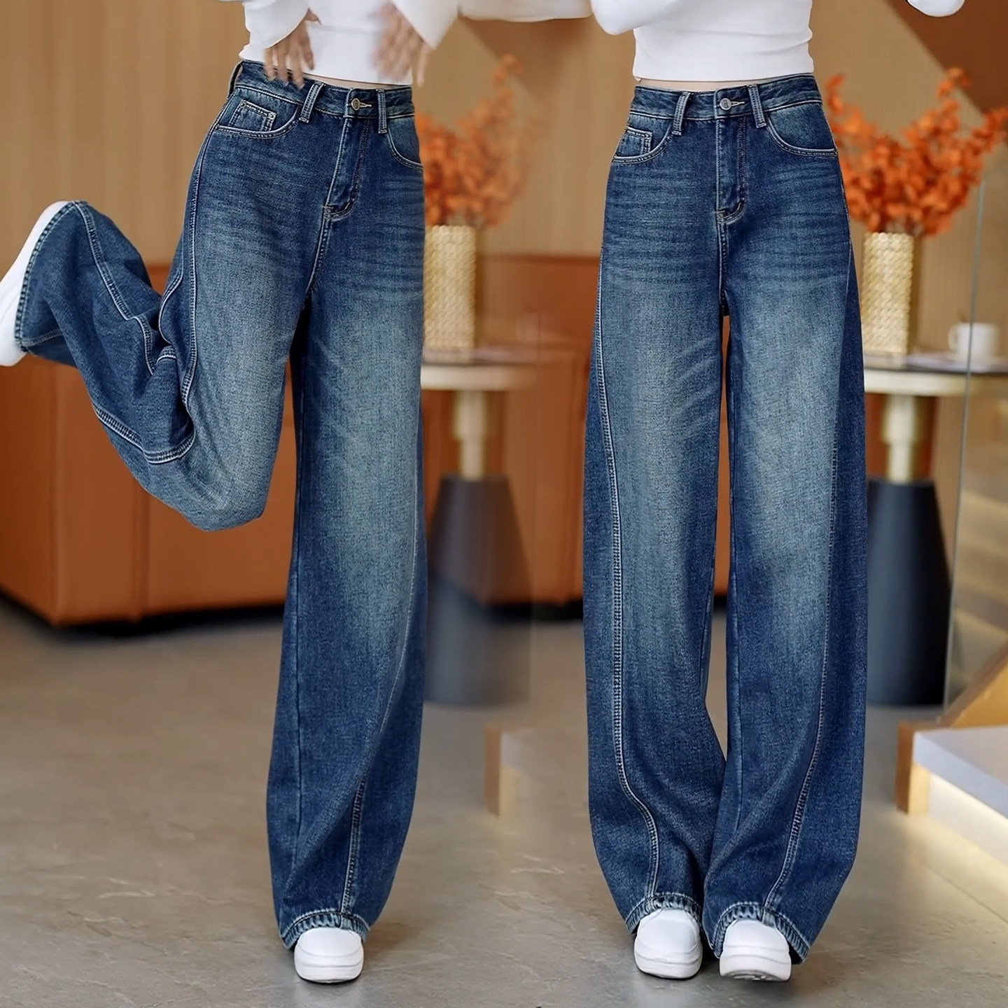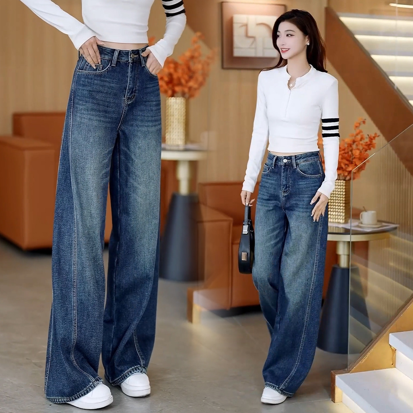 复古蓝色高腰阔腿弯刀牛仔裤女