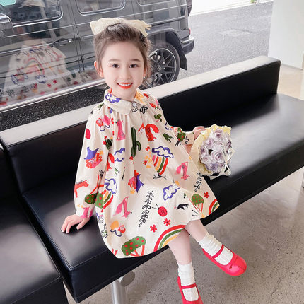儿童满版卡通衬衫裙春秋女宝宝连衣裙长袖棉布女童娃娃领裙子秋装