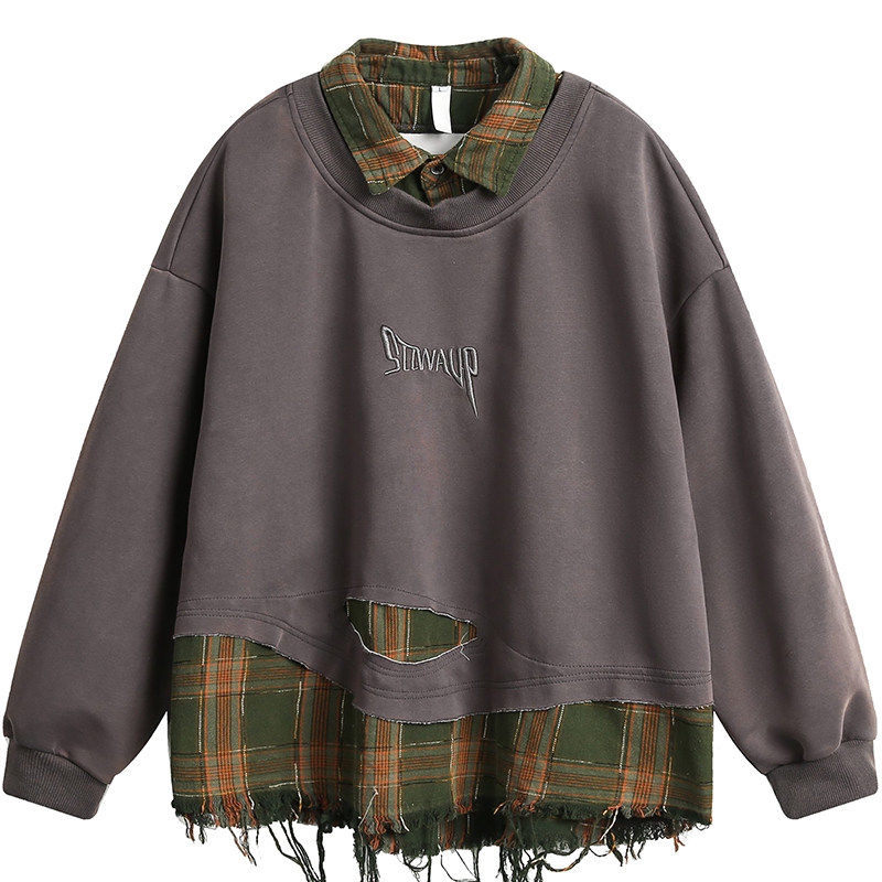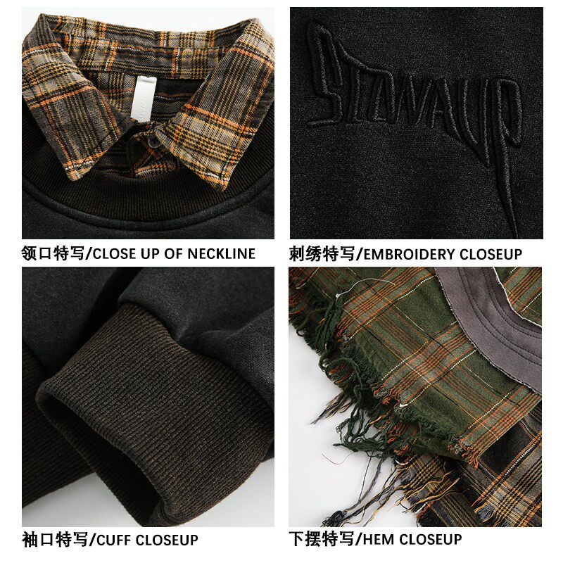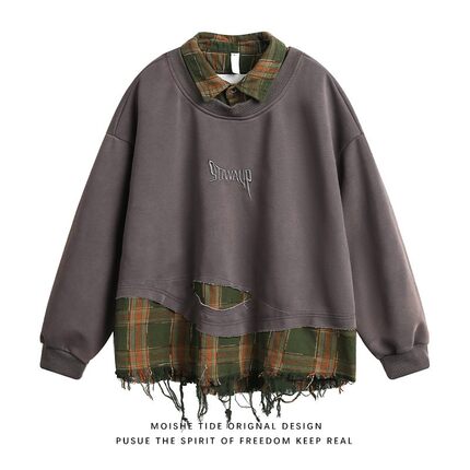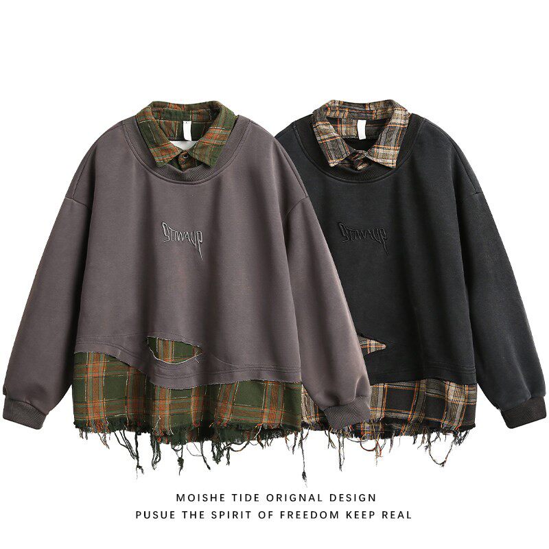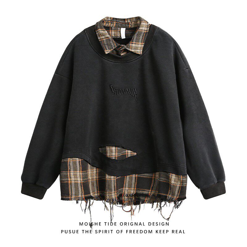 MOISHE TIDE美式复古格子拼接破坏翻领卫衣男女宽松潮流百搭上衣
