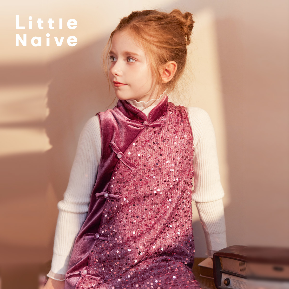LittleNaive儿童新中式珠片旗袍背心裙秋冬女童丝绒拜年服连衣裙