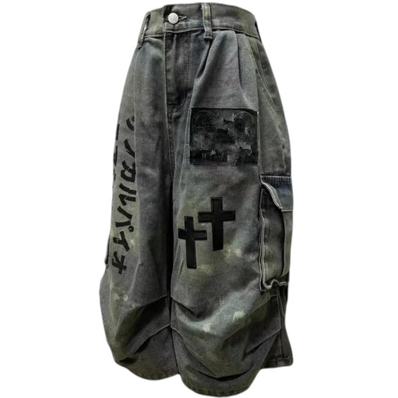 美式复古七分牛仔裤女夏季新款废土风做旧皱褶贴布阔腿宽松中裤子