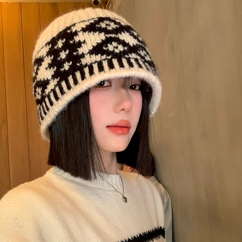 复古拼色菱形格子针织毛线帽秋冬季显脸小包头冷帽大头围保暖帽子