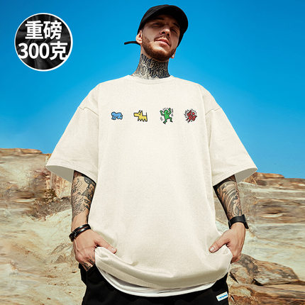 300g重磅潮牌宽松日系T恤短袖五分袖纯棉杏色情侣加肥加大码男装
