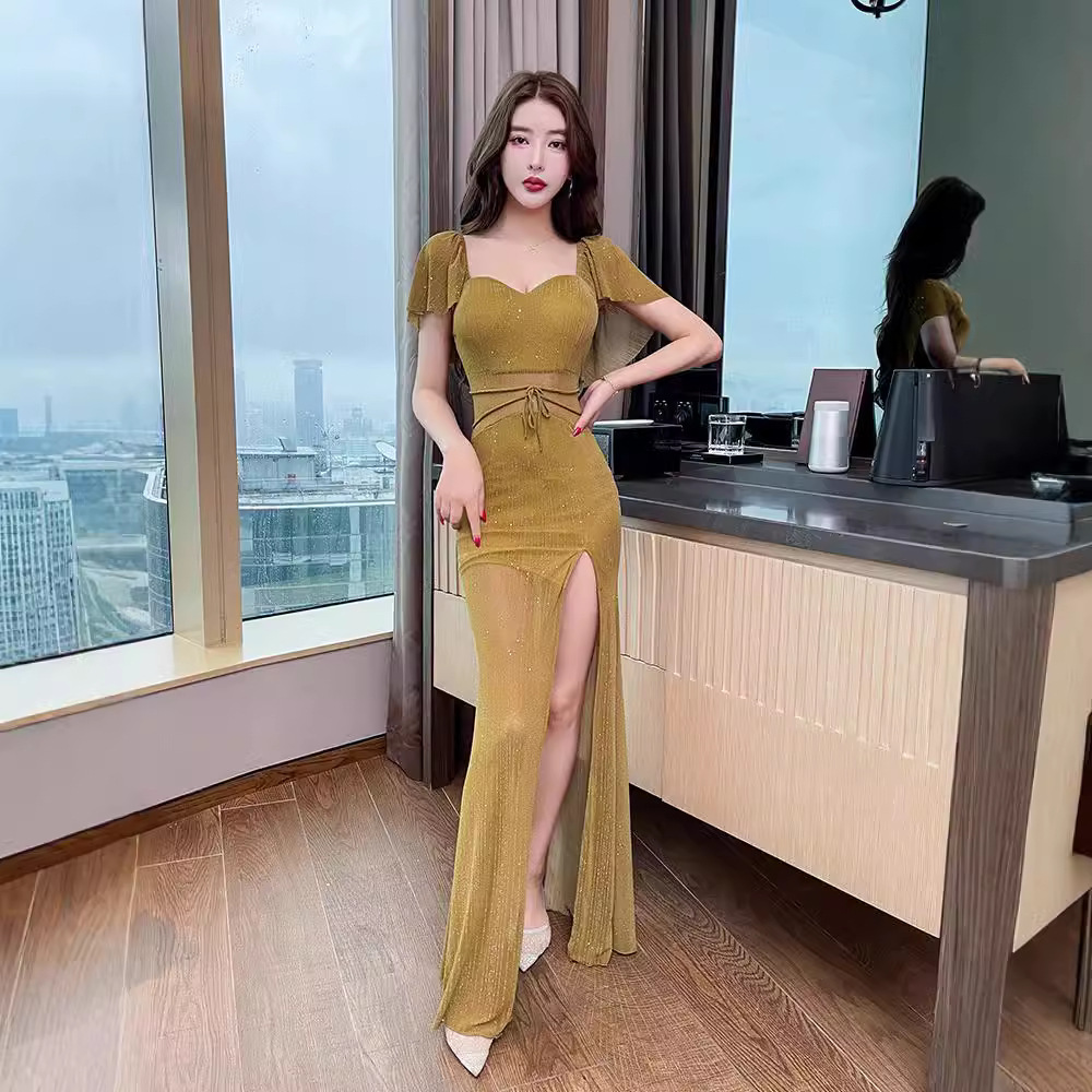 晚礼服裙女高端2025夏款气质性感修身连衣裙荷叶袖v领包臀裙长裙
