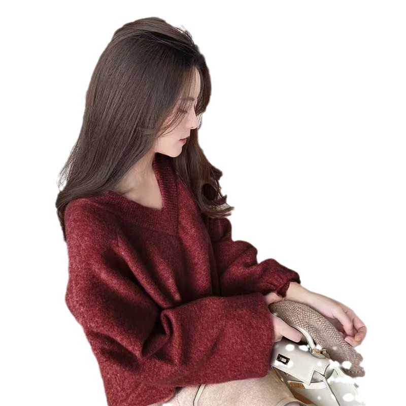 高级感V领粉色毛衣女秋冬套头慵懒风显瘦2025宽松针织衫打底上衣