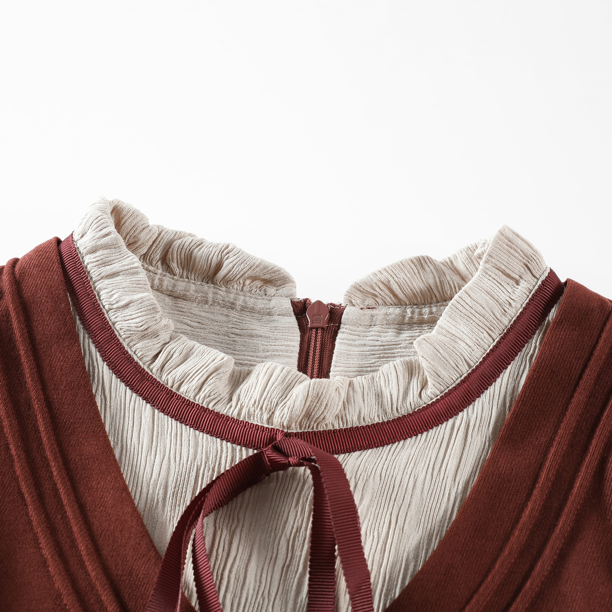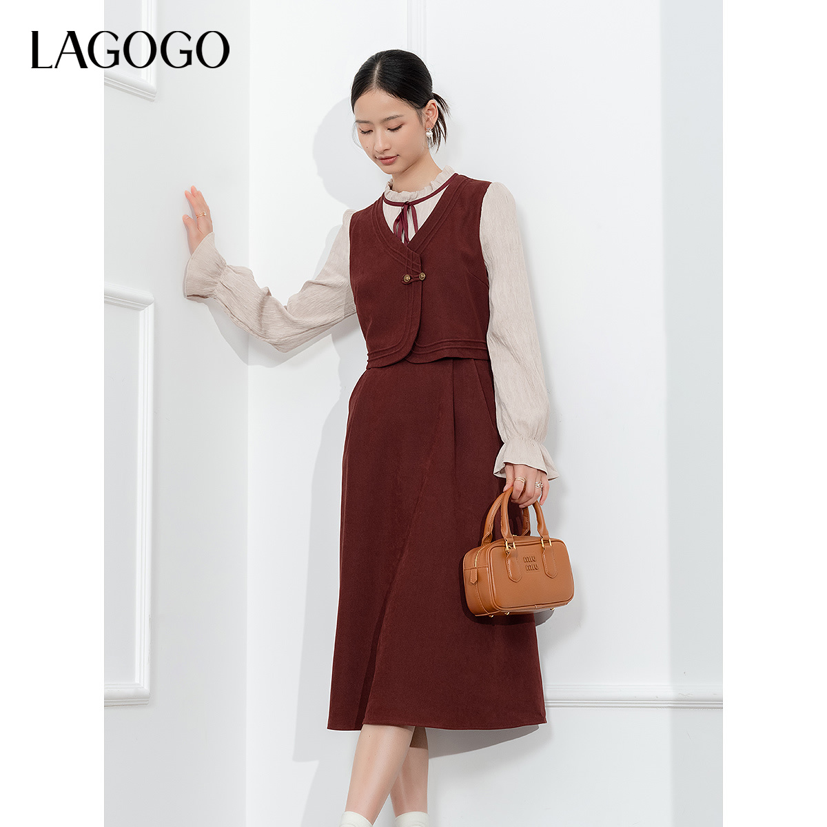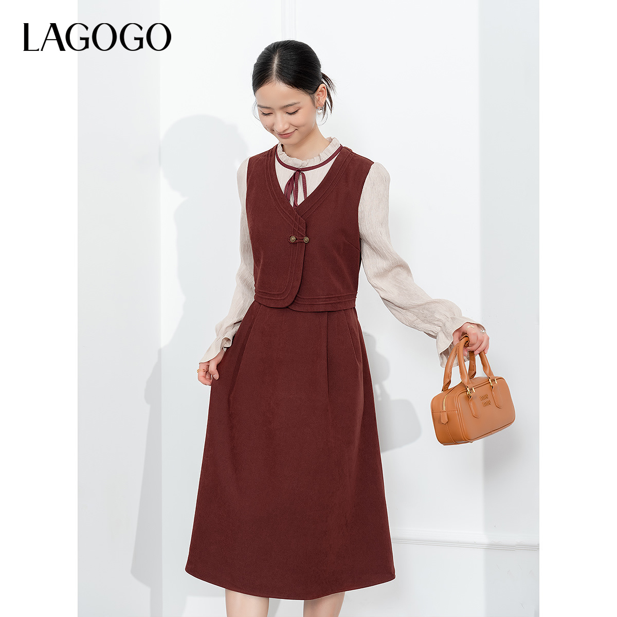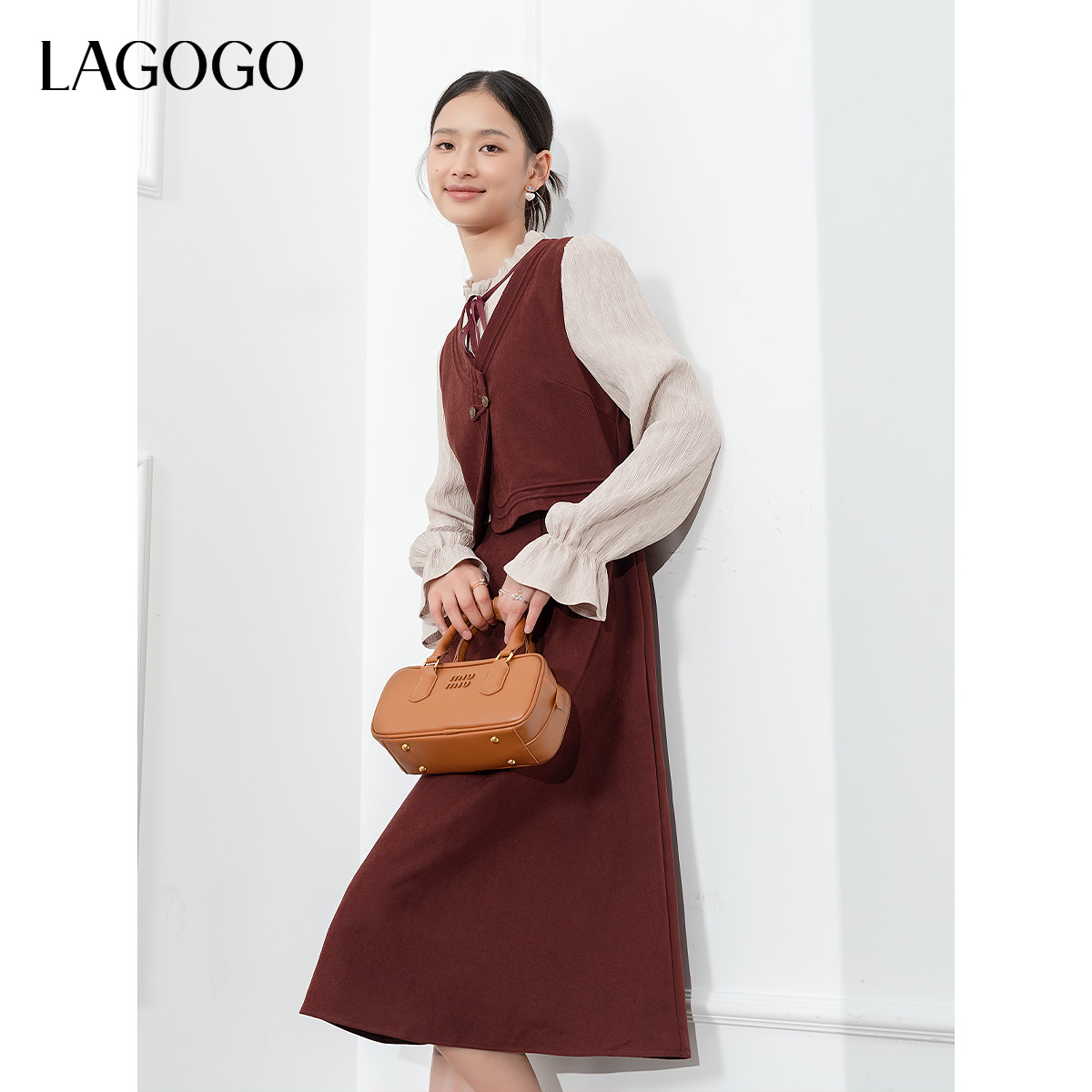 LAGOGO假两件优雅舒适质感连衣裙女拉谷谷春秋新款复古甜美A字裙