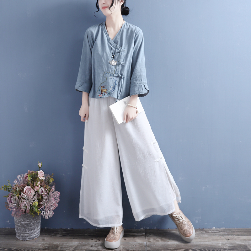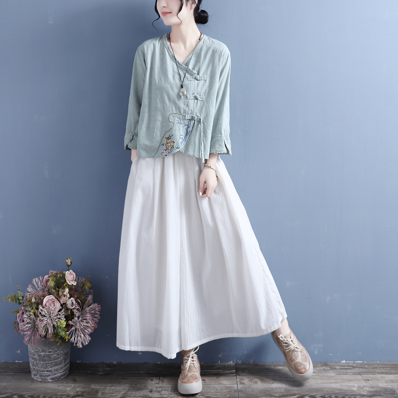 棉麻刺绣木耳V领衬衫女2022春季新款中国风斜襟盘扣复古短款上衣